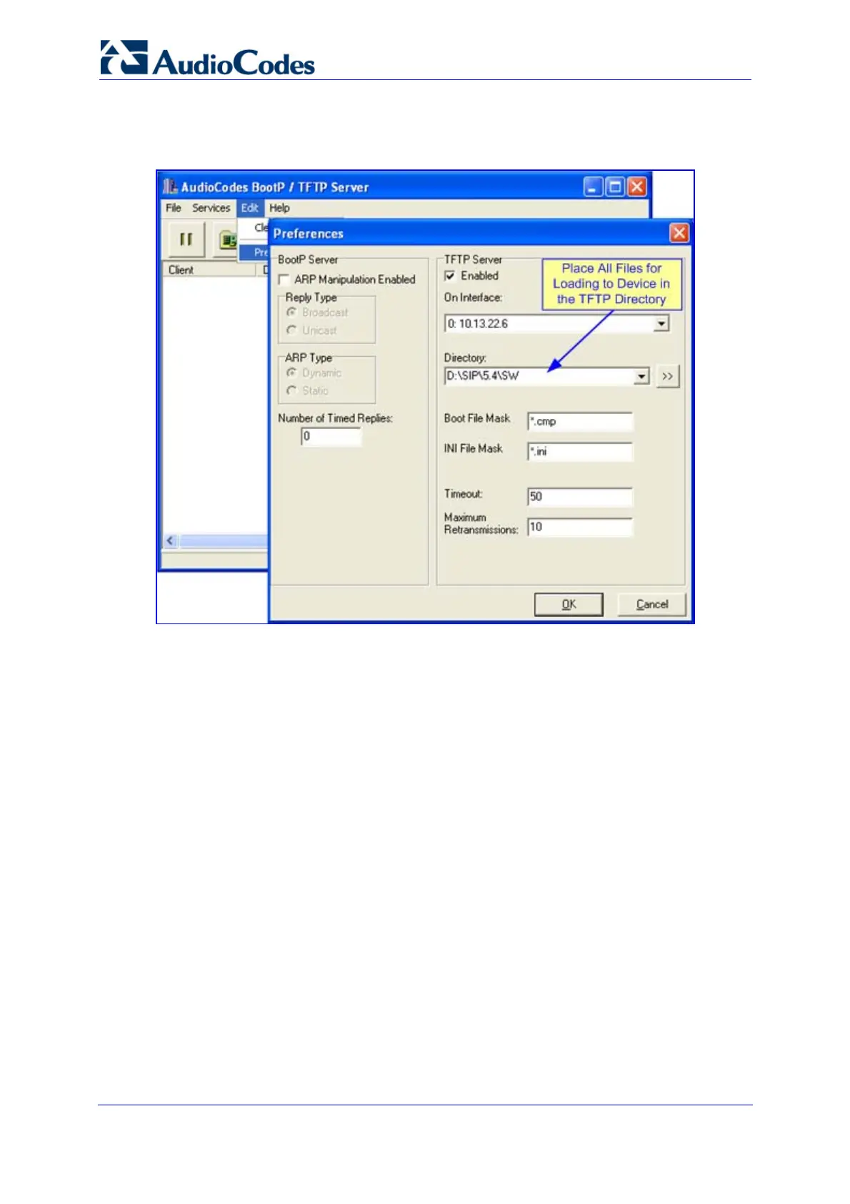 The TFTP server is defined in the BootP/TFTP Server utility's 'Preferences' dialog box, as