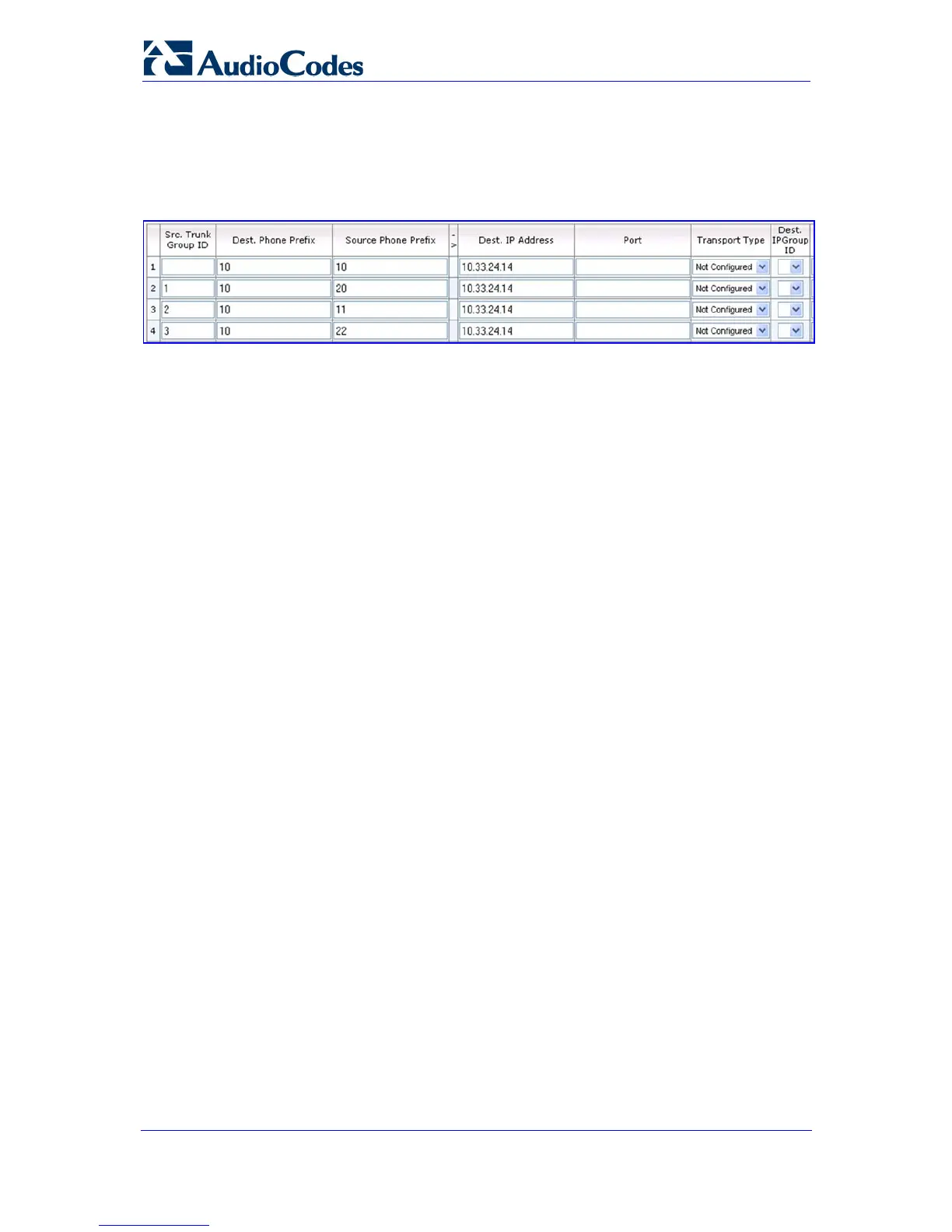 e. In the 'Dest. IP Address' column, enter 10.33.24.14 (i.e., calls are sent to this IP