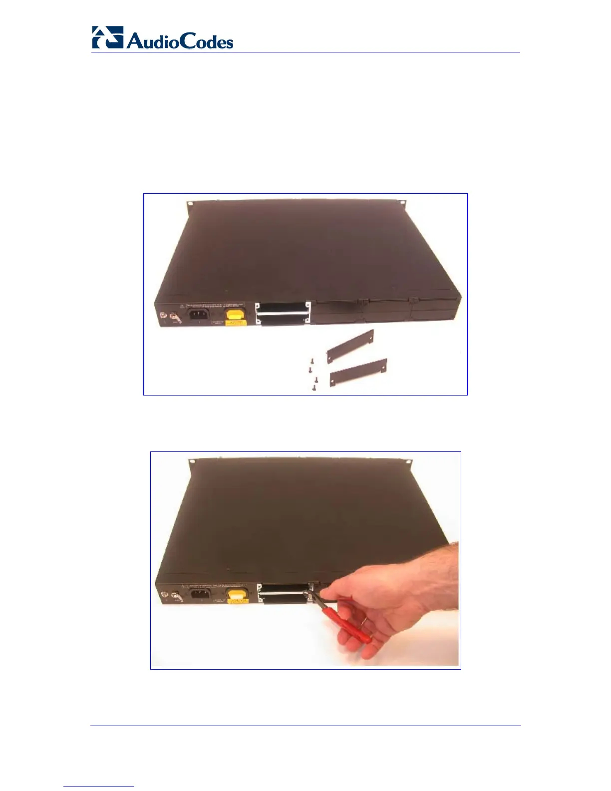 1. On the device's rear panel, remove the black metal cover plates in the first and second