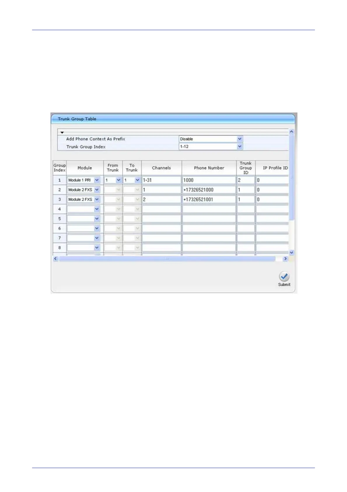 1. Open the 'Trunk Group Table' page (Configuration tab > Protocol Configuration menu >