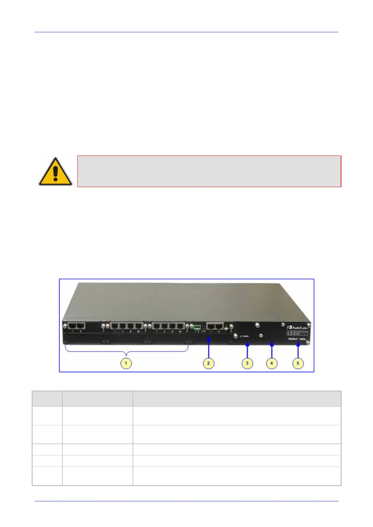 The Mediant 1000B chassis’ front panel is displayed in the figure below and described