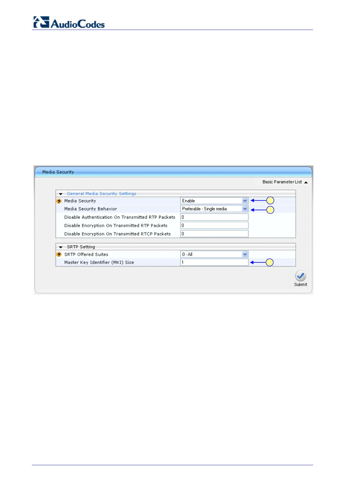 2. From the ‘Media Security’ drop-down list, select “Enable”, to enable SRTP.