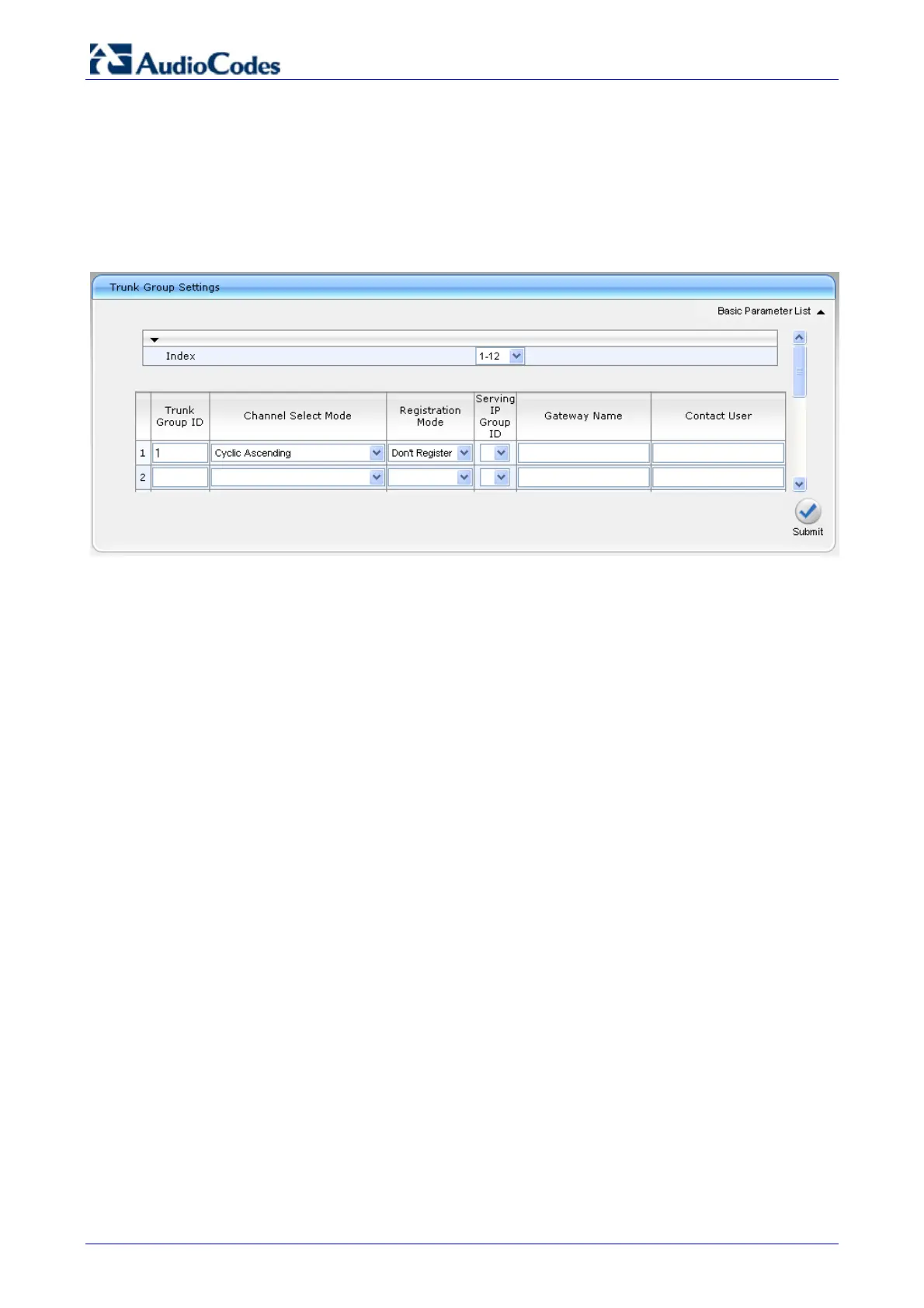 1. Open the 'Trunk Group Settings' page (Configuration tab > Protocol Configuration menu