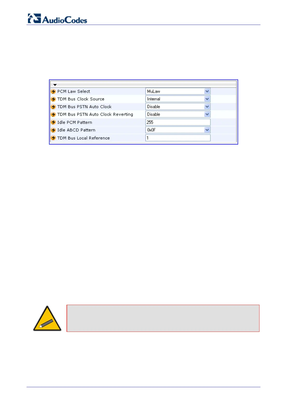 • PCM Law Select - determines the type of PCM companding law in input/output TDM