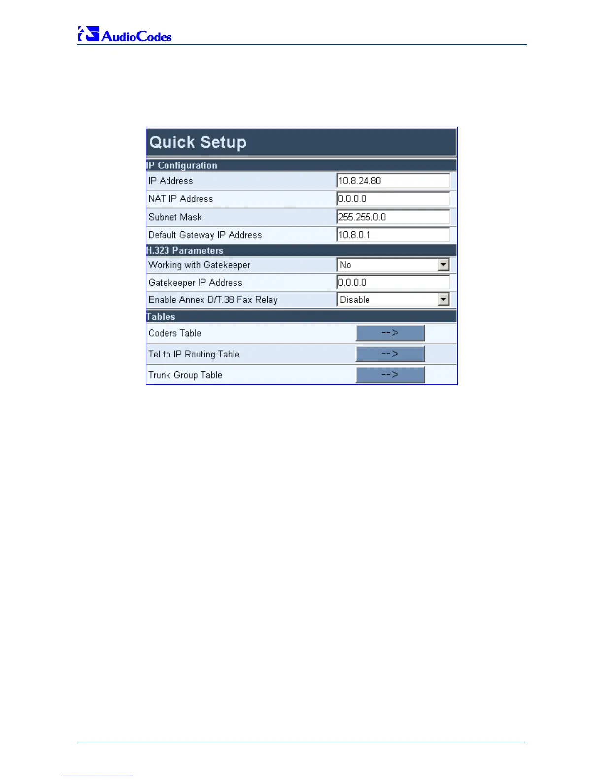Figure 3-4: Mediant 1000 / H.323 'Quick Setup' Screen