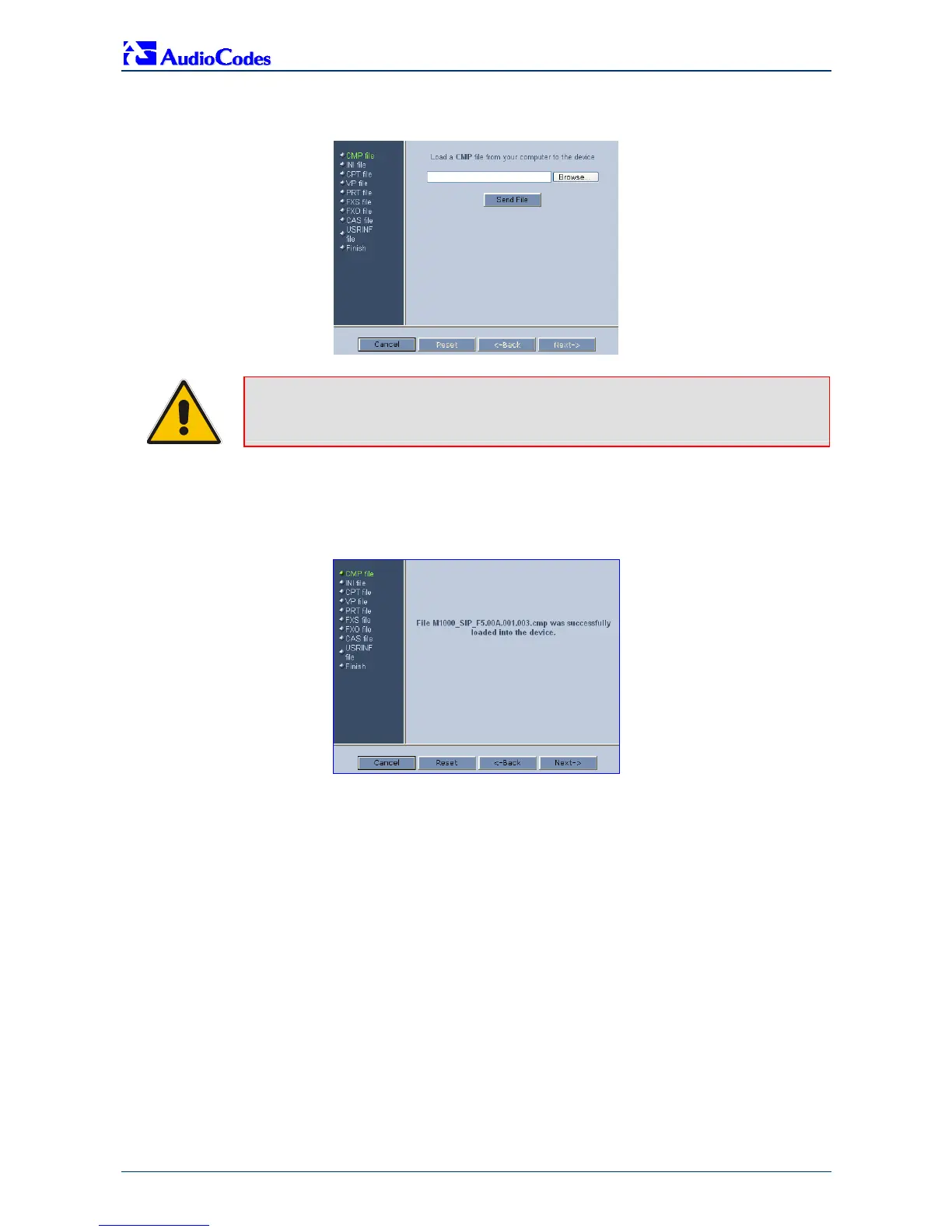 • Click Cancel; the Mediant 1000 resets utilizing the cmp, ini and all other configuration