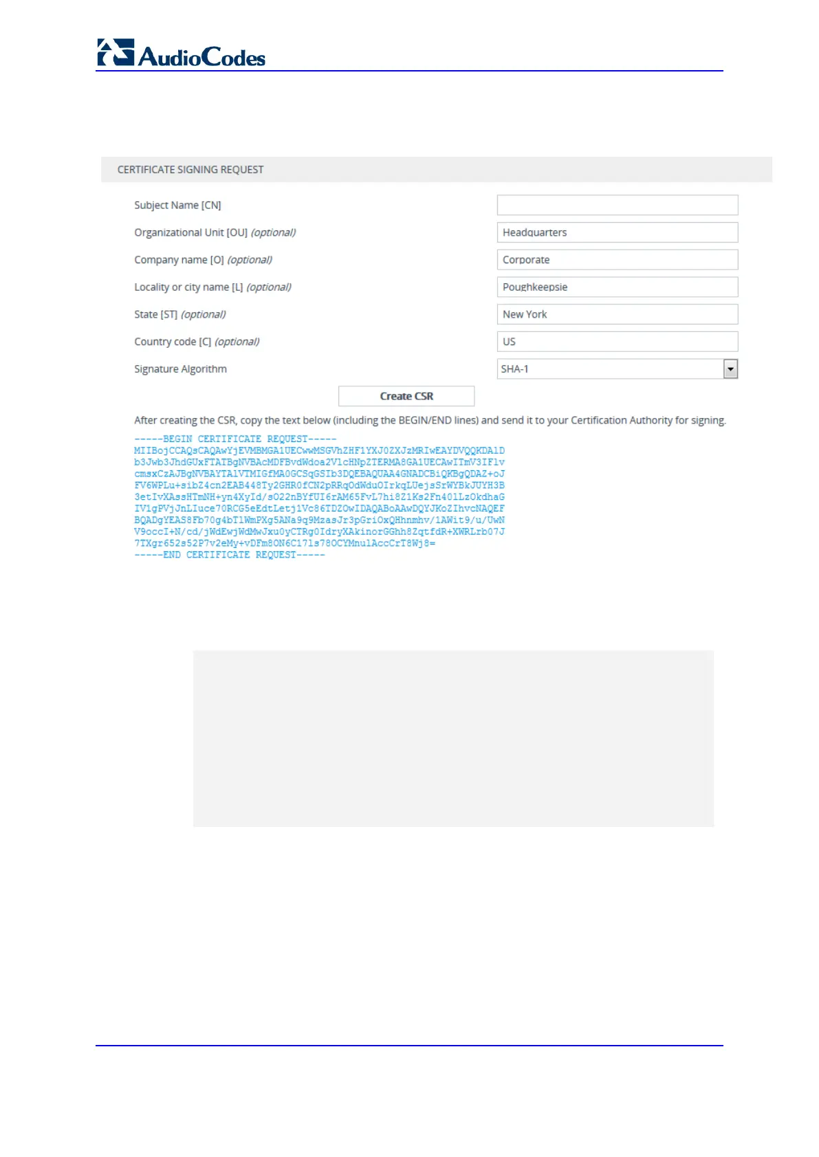 d. Click the Create CSR button; a textual certificate signing request is displayed in
