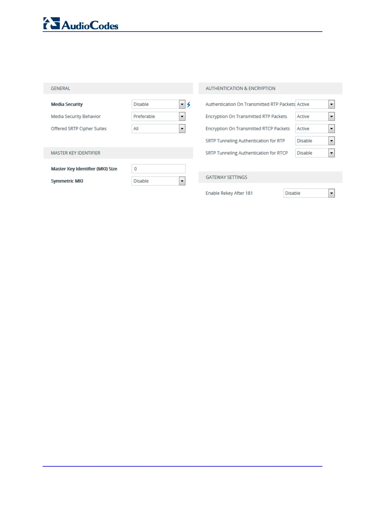 2. From the 'Media Security' drop-down list (EnableMediaSecurity), select Enable to