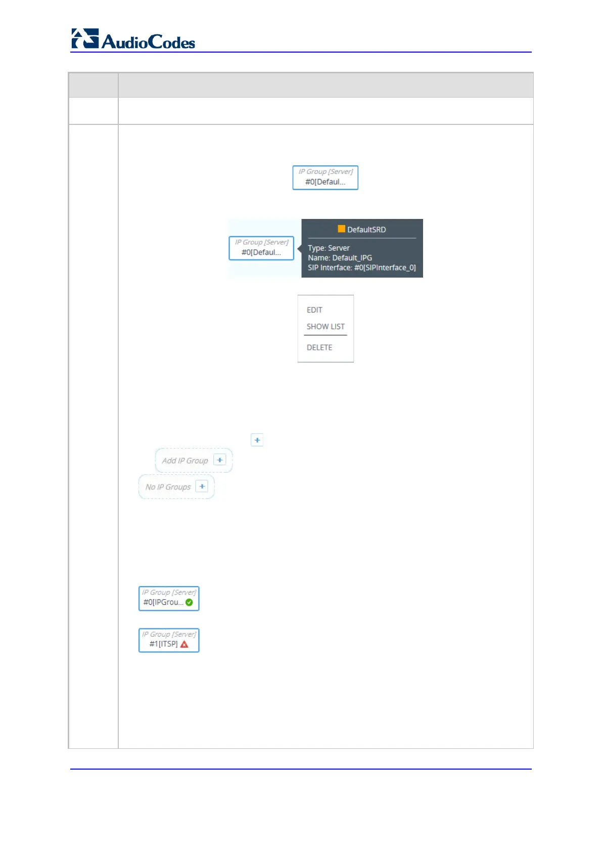 For more information on configuring IP Groups, see ''Configuring IP Groups'' on page 333.
