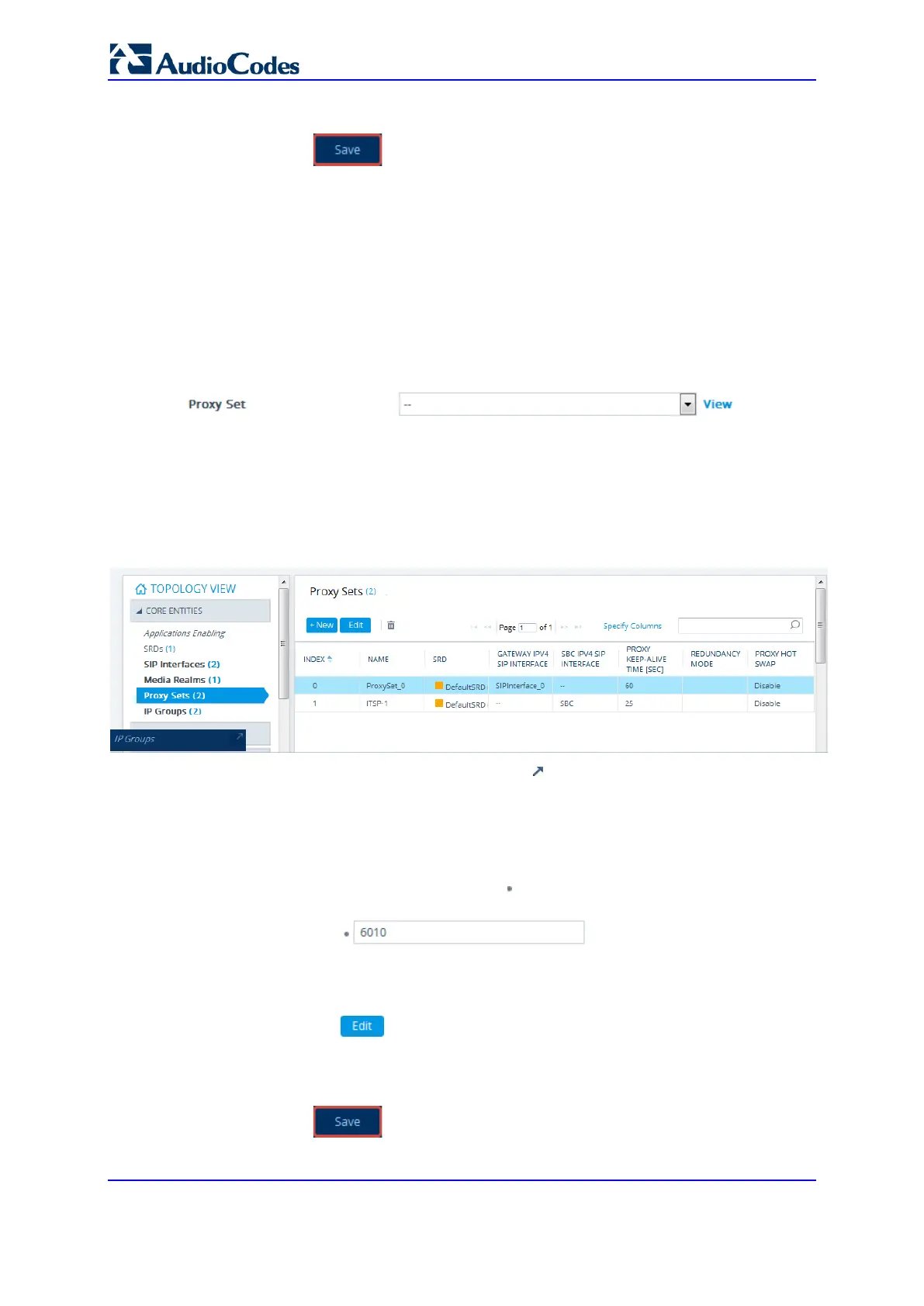 Web interface and the row-referenced table (e.g., Proxy Sets table) opens, as shown in the