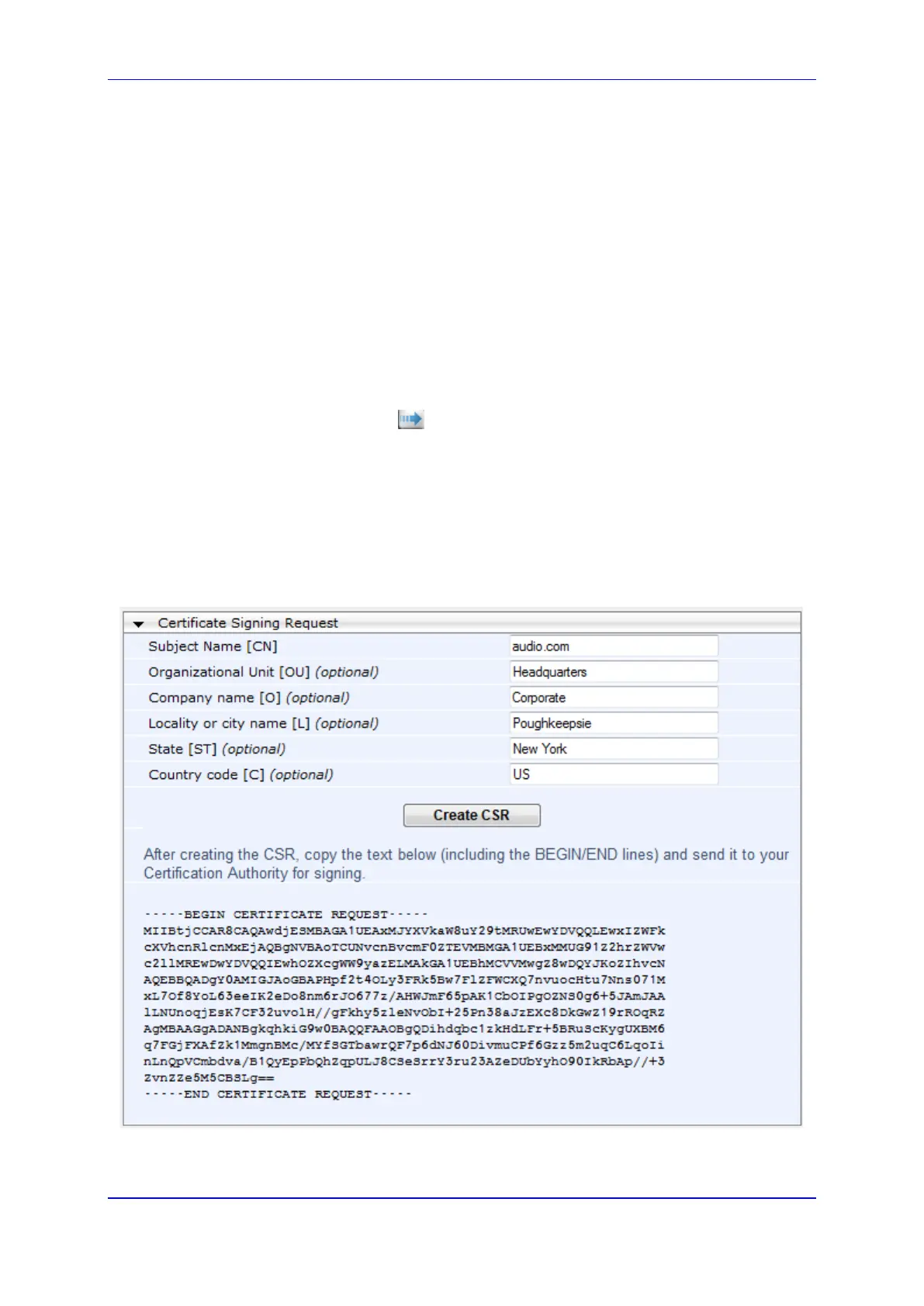 c. Click the Create CSR button; a textual certificate signing request is displayed in