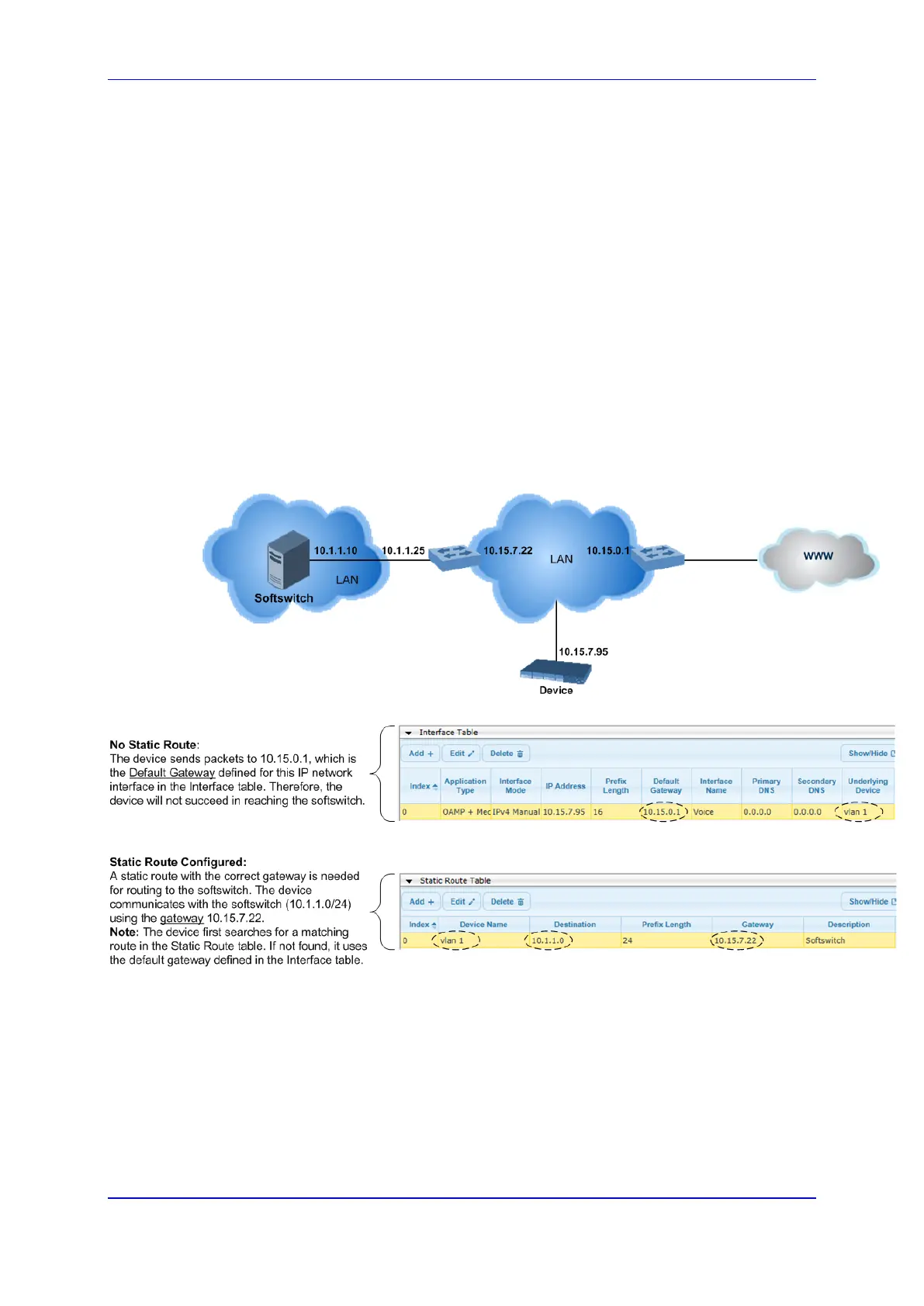 do not reach the softswitch. To resolve this problem, a static route is configured to specify