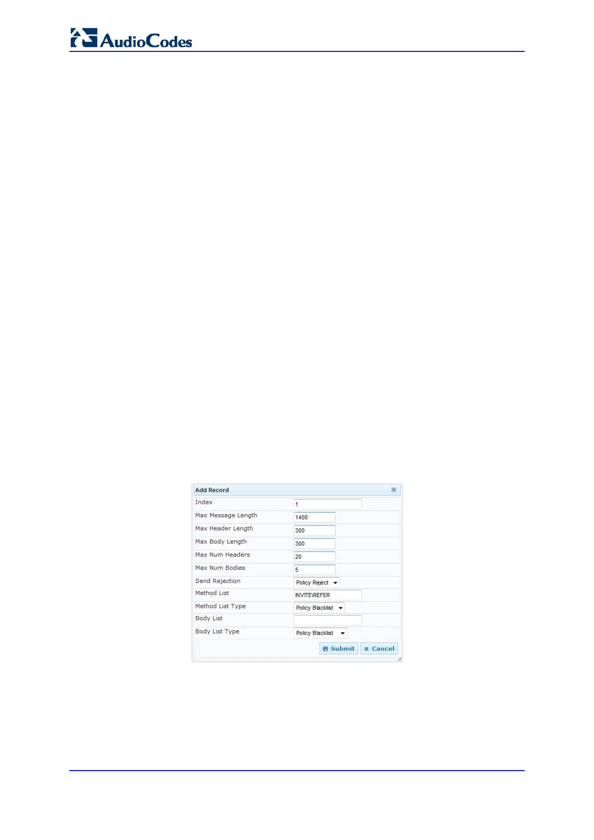 1. Open the Message Policy Table page (Configuration tab > VoIP menu > SIP