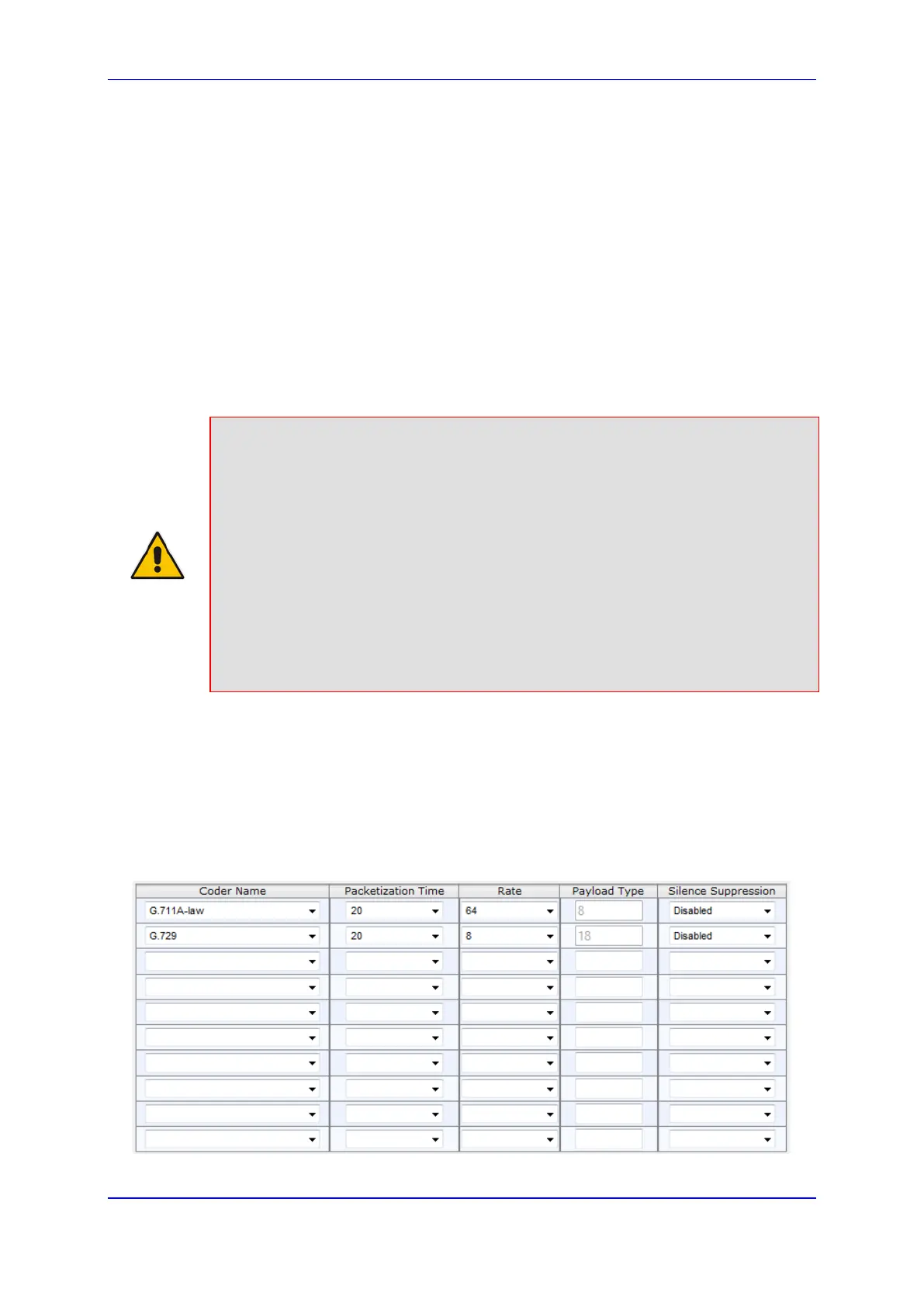 Each coder can be configured with packetization time (ptime), bit rate, payload type, and