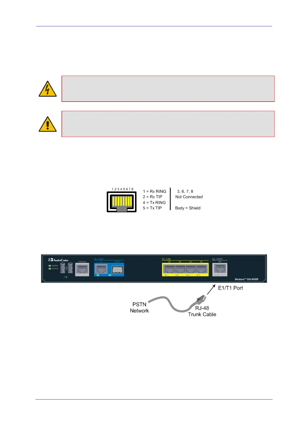 1. Connect the E1/T1 trunk cable to the device’s E1/T1 port.
