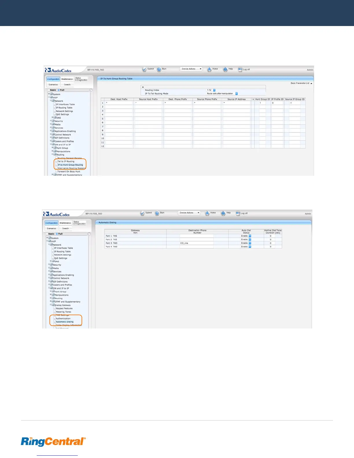 •  Navigate to VoIP / GW and IP to IP / Routing / IP to Hunt Group Routing and set up row 1 as shown. You can restrict outbound to FXO
