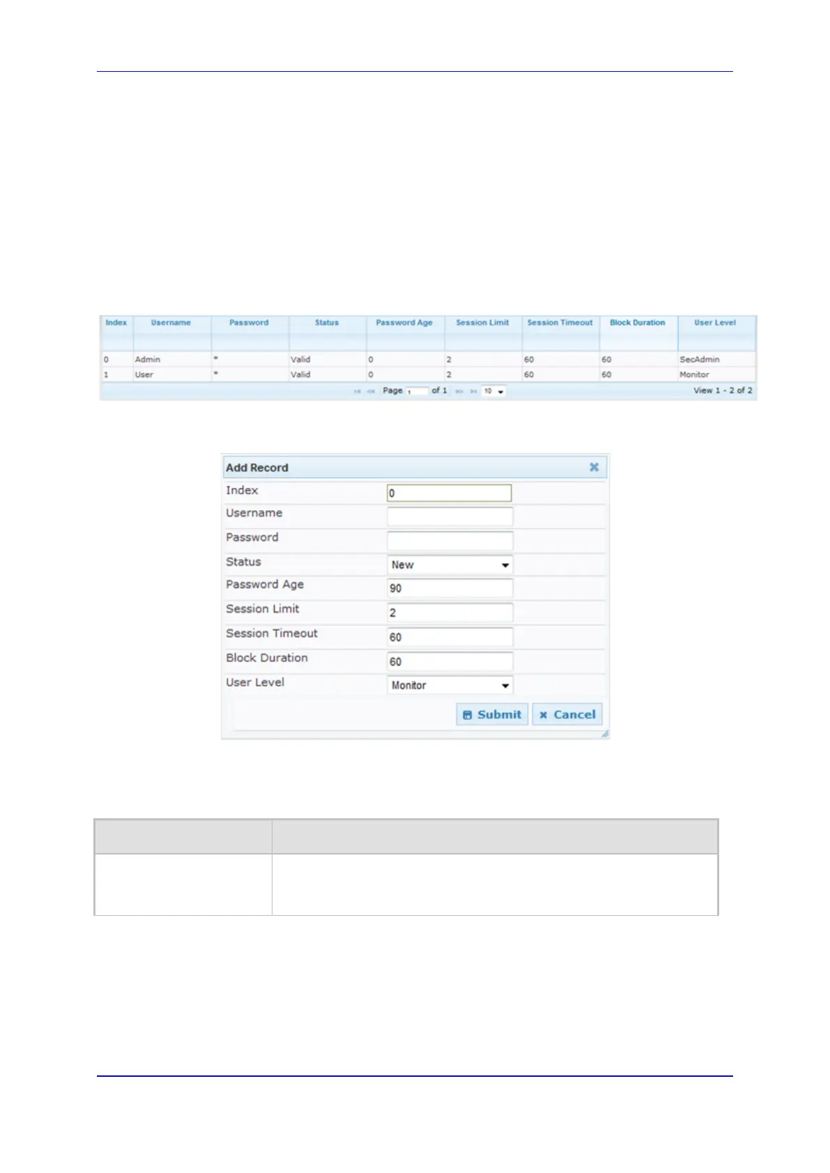 3. Add a user as required. For a description of the parameters, see the table below.