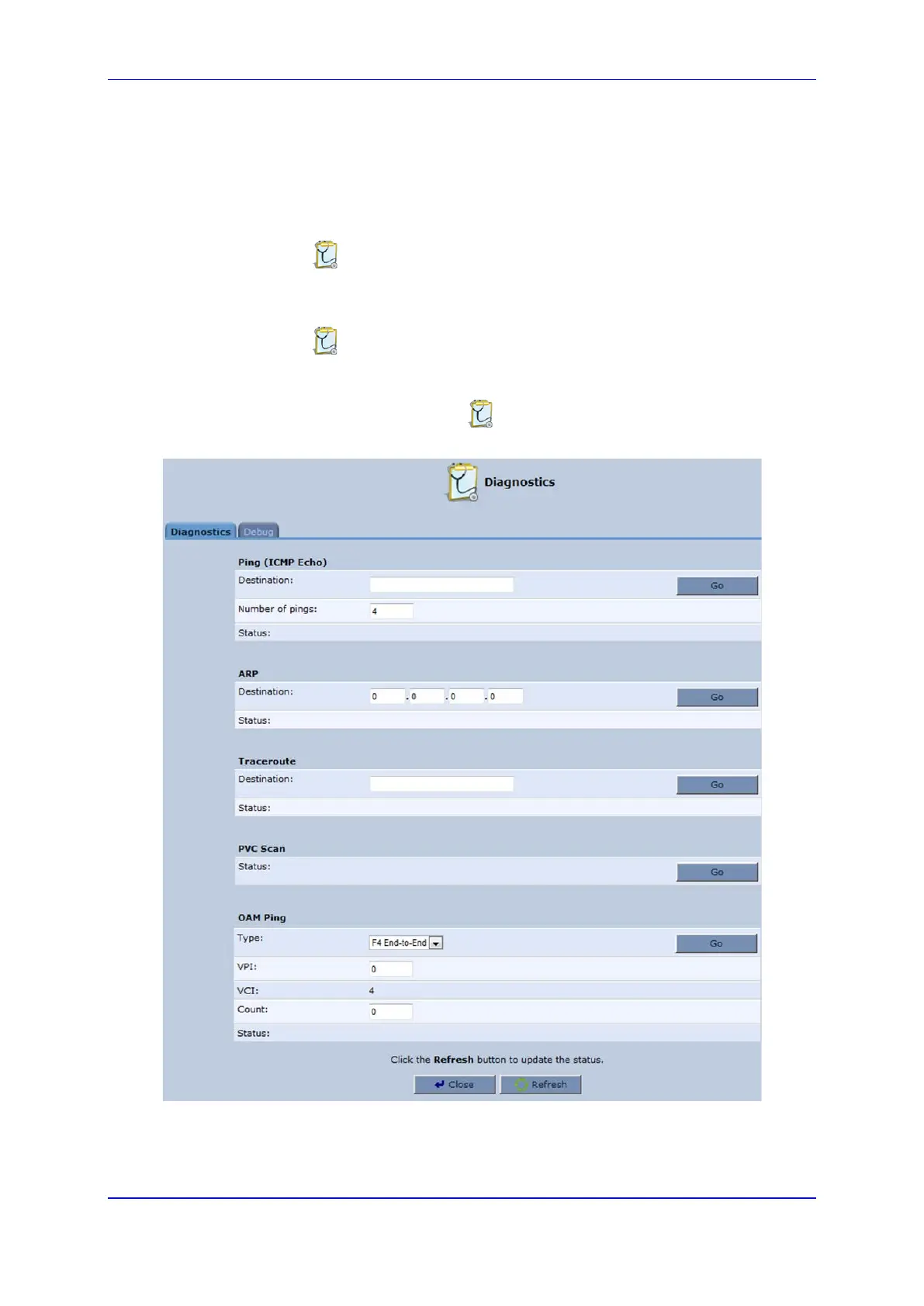 The Diagnostics icon allows you to test network connectivity. In addition, it allows you