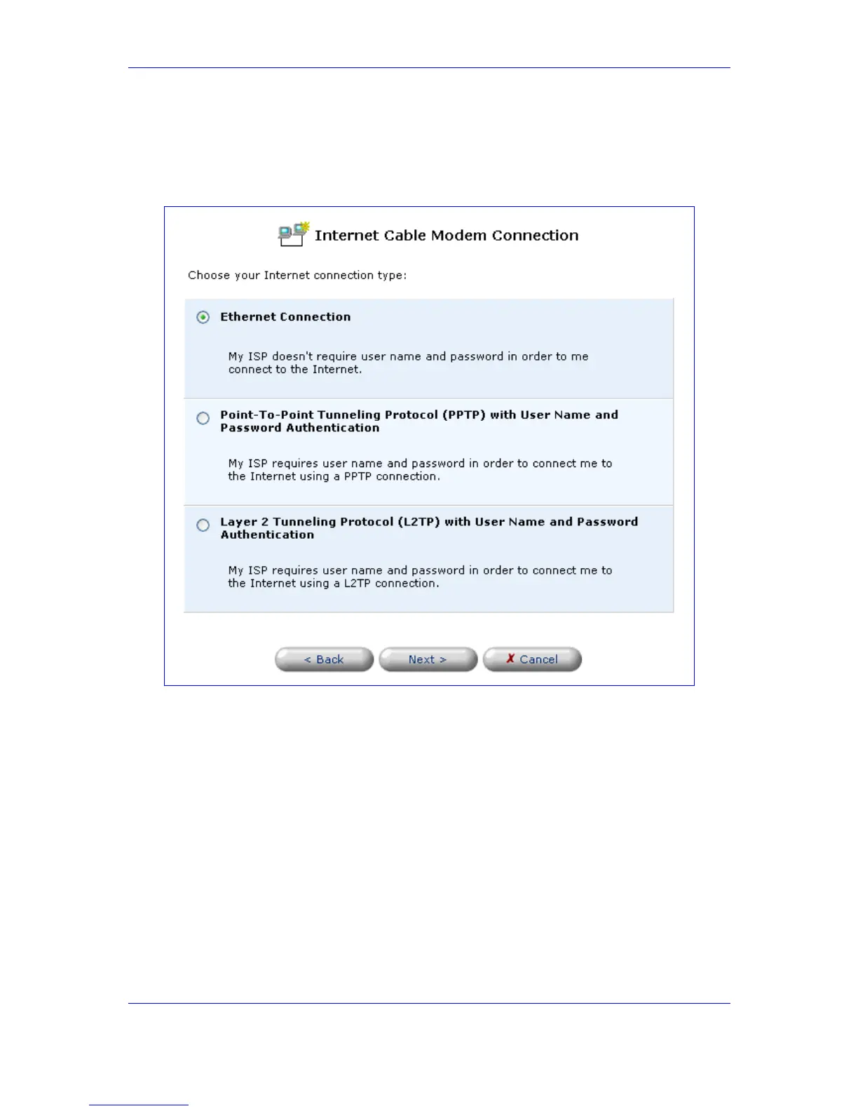 external cable modems) and click 'Next'; the screen 'Internet Cable Modem