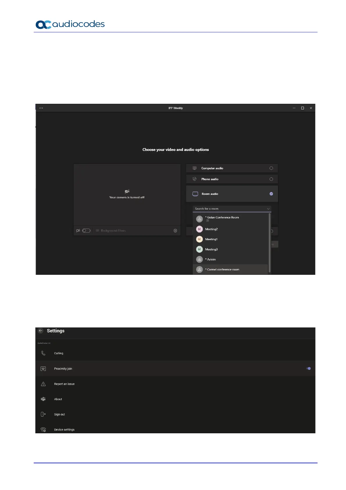 After you select the room audio device, the meeting is opened without any audio device on your PC