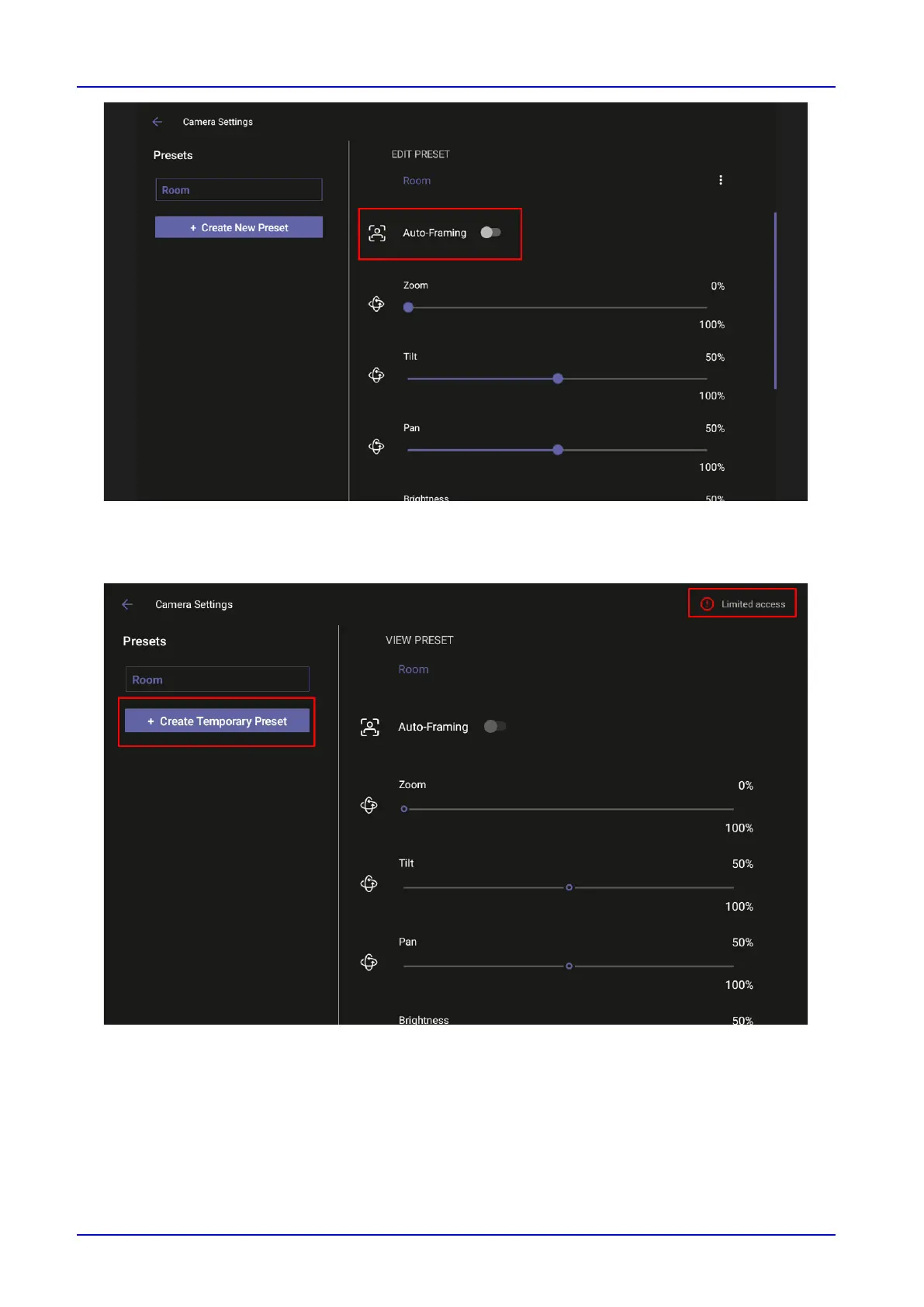 Camera Settings or if another end user later enters; temporary presets are only for that meeting
