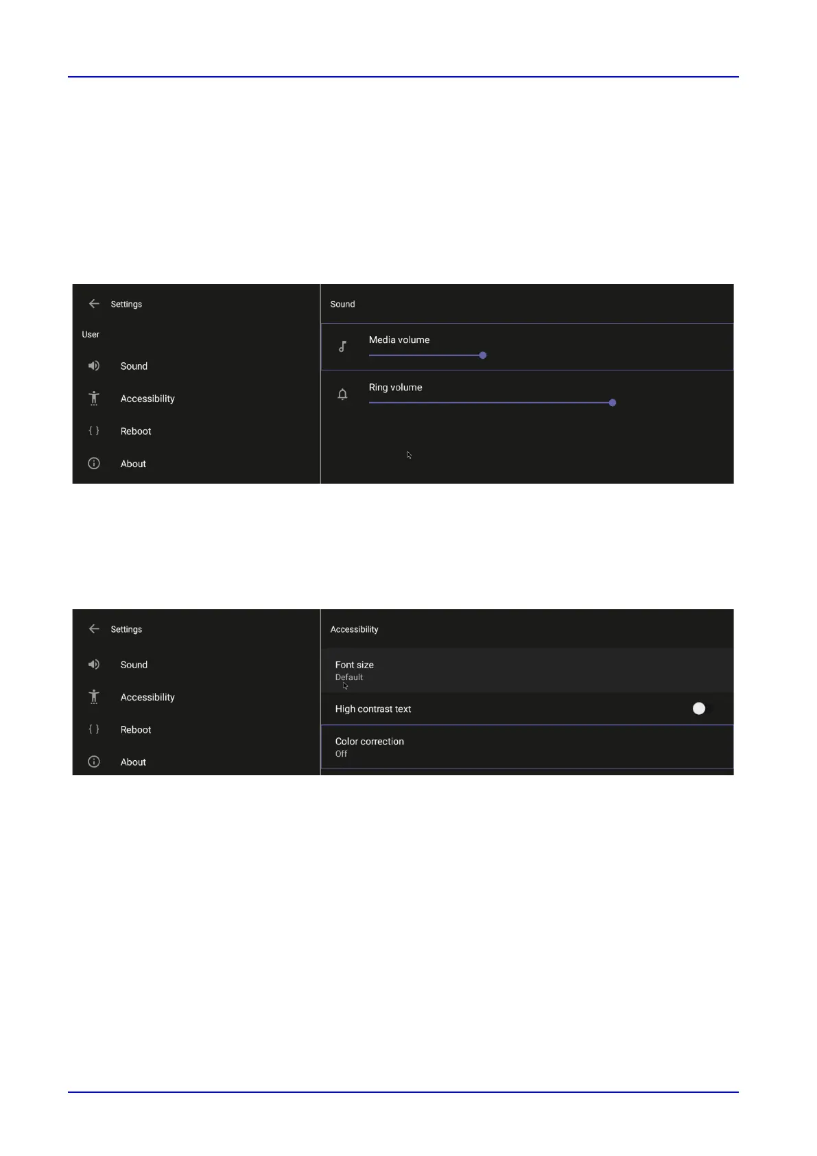 Accessibility, Reboot and About (read-only).