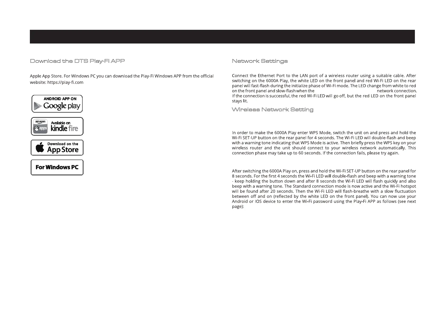 Audiolab 6000A Play - Downloading and Using the DTS Play-Fi App; DTS Play-Fi App Download Sources; Wired and Wireless Network Setup; Wireless Connection Modes (WPS;Standard)