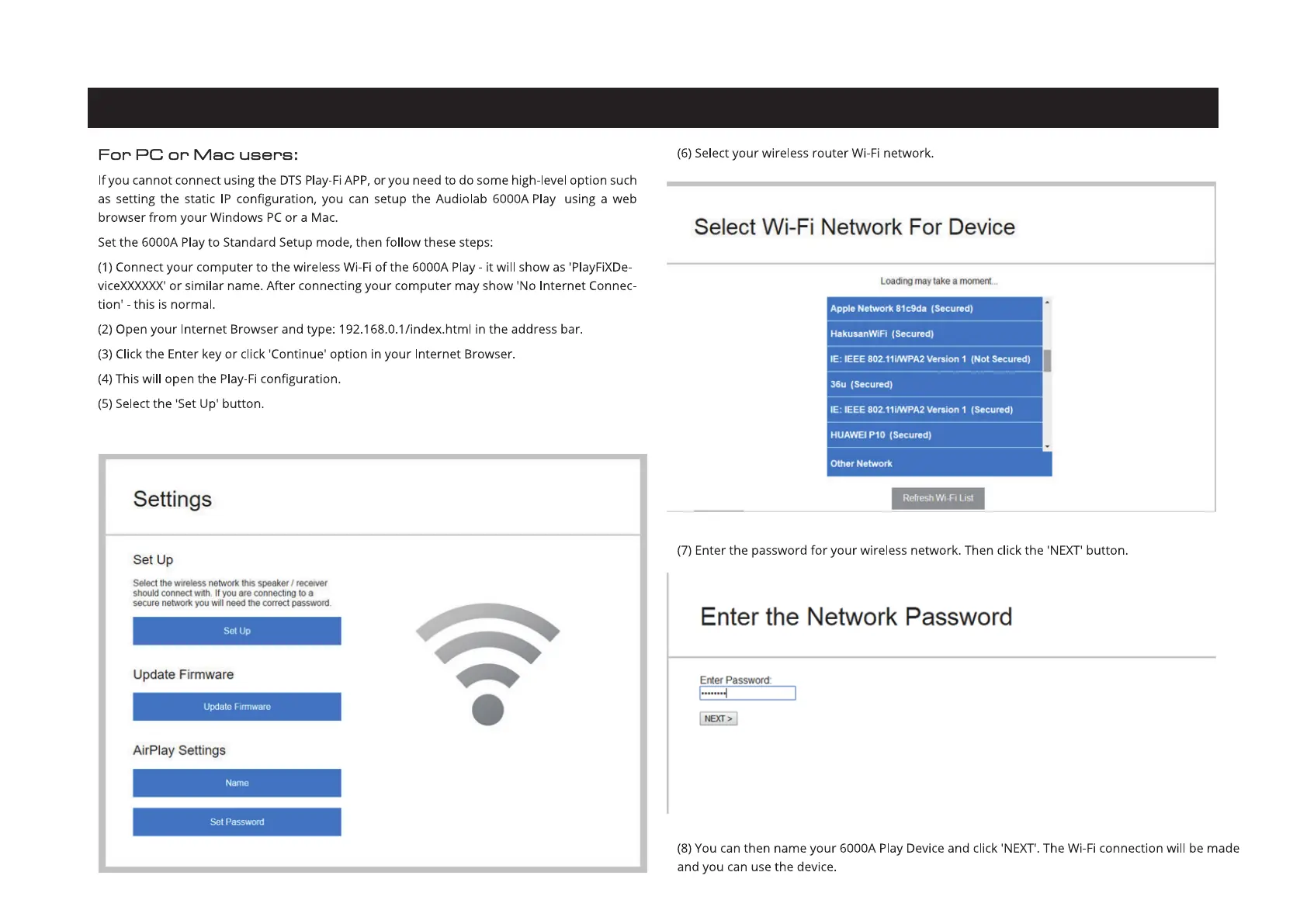 Audiolab 6000A Play - Wi-Fi Connection Setup via PC or Mac; Connecting via Web Browser Interface; Network Selection and Password Entry