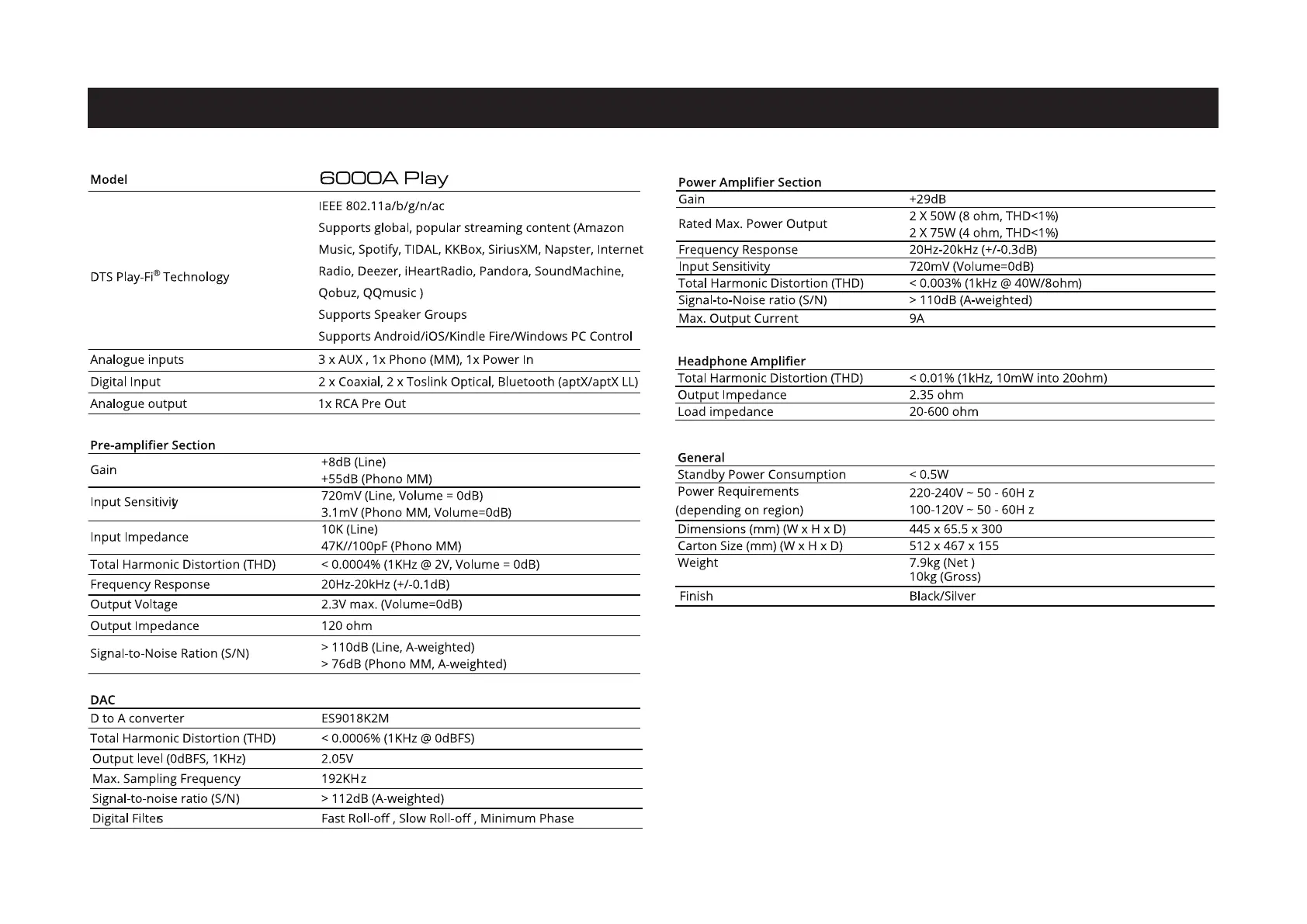 Audiolab 6000A Play - Technical Specifications; Connectivity and Input;Output Specifications; Amplifier and DAC Performance Metrics; General and Physical Device Specifications
