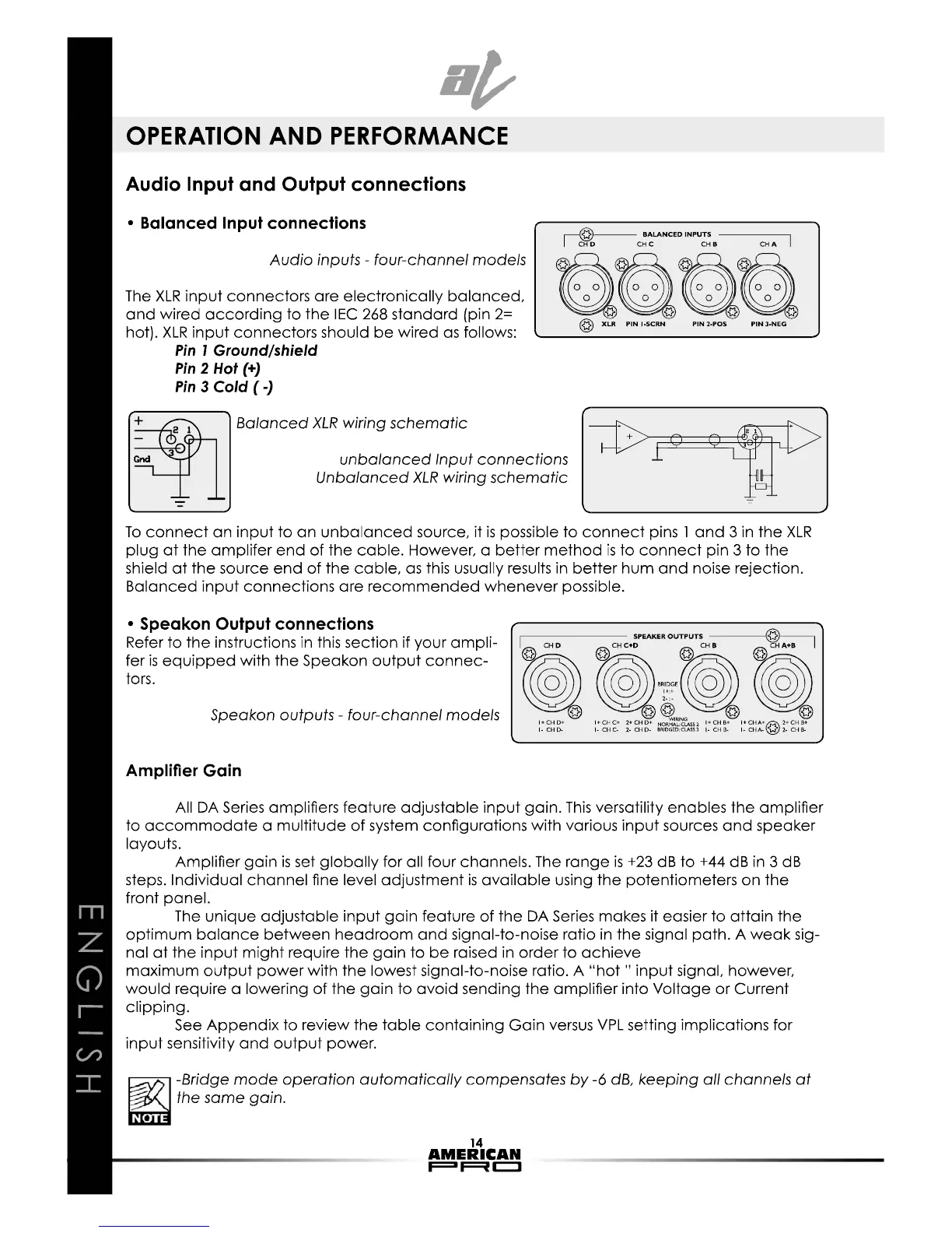 Audiolab DA-4000 - Operation and Performance; Audio Input and Output Connections; Amplifier Gain Adjustment
