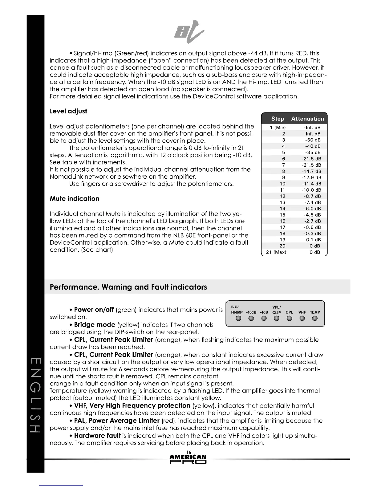 Audiolab DA-4000 - Channel Gain;Level Adjustment (Cont.); Mute Indication; Performance, Warning and Fault Indicators; Common Indicators