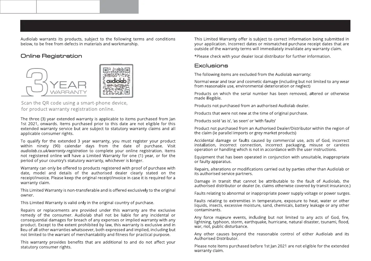 Audiolab DC BLOCK - Warranty Coverage; Online Registration; Exclusions