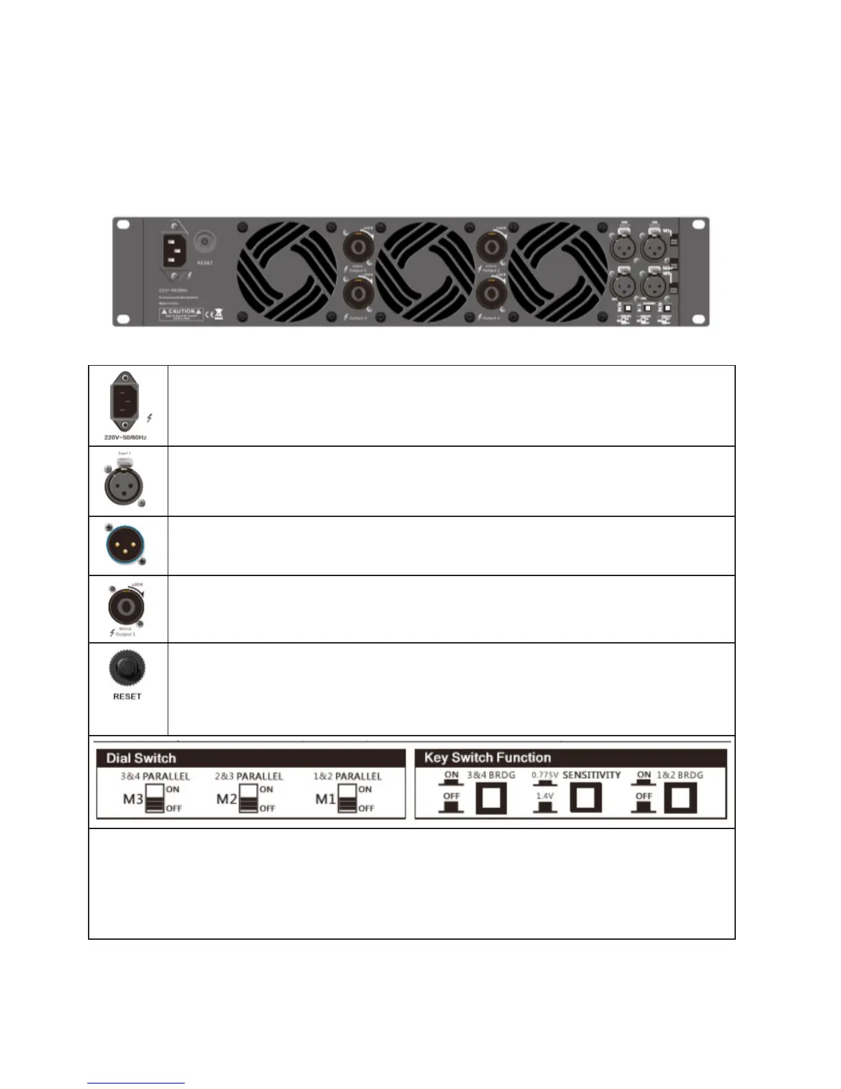 Mainly complete the switching of MONO mode and BRIDGE/PARALLEL by adjusting. There are M1/M2/