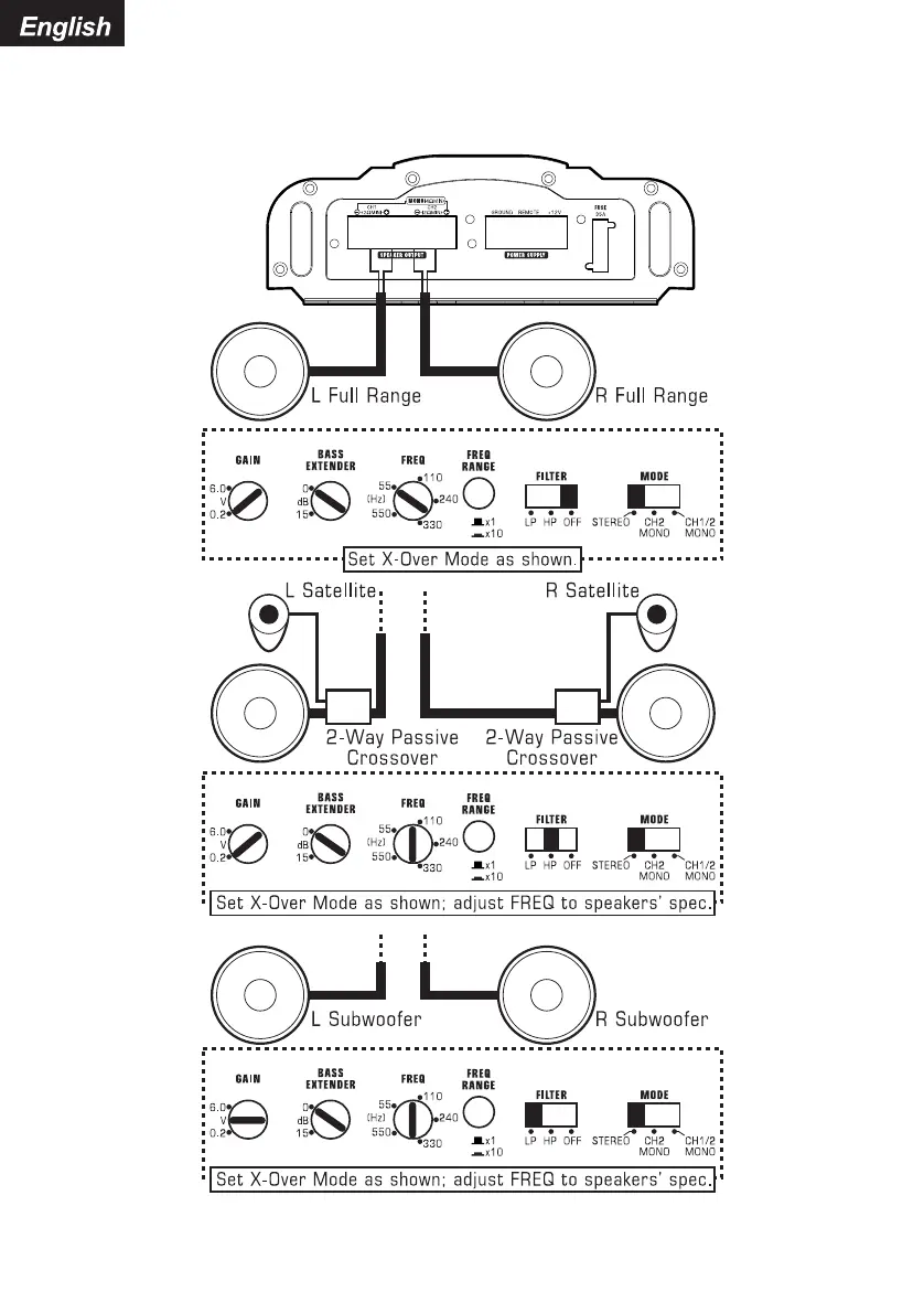 or subwoofer) speakers. NOTE: A passive crossover must be used with satellite speakers.