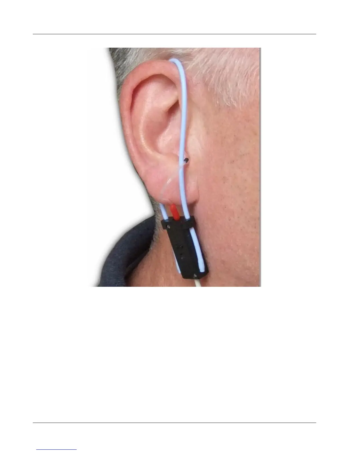 Probe tube insertion: The blue lanyard holds the tube in place and the depth marker is at the intertragal notch