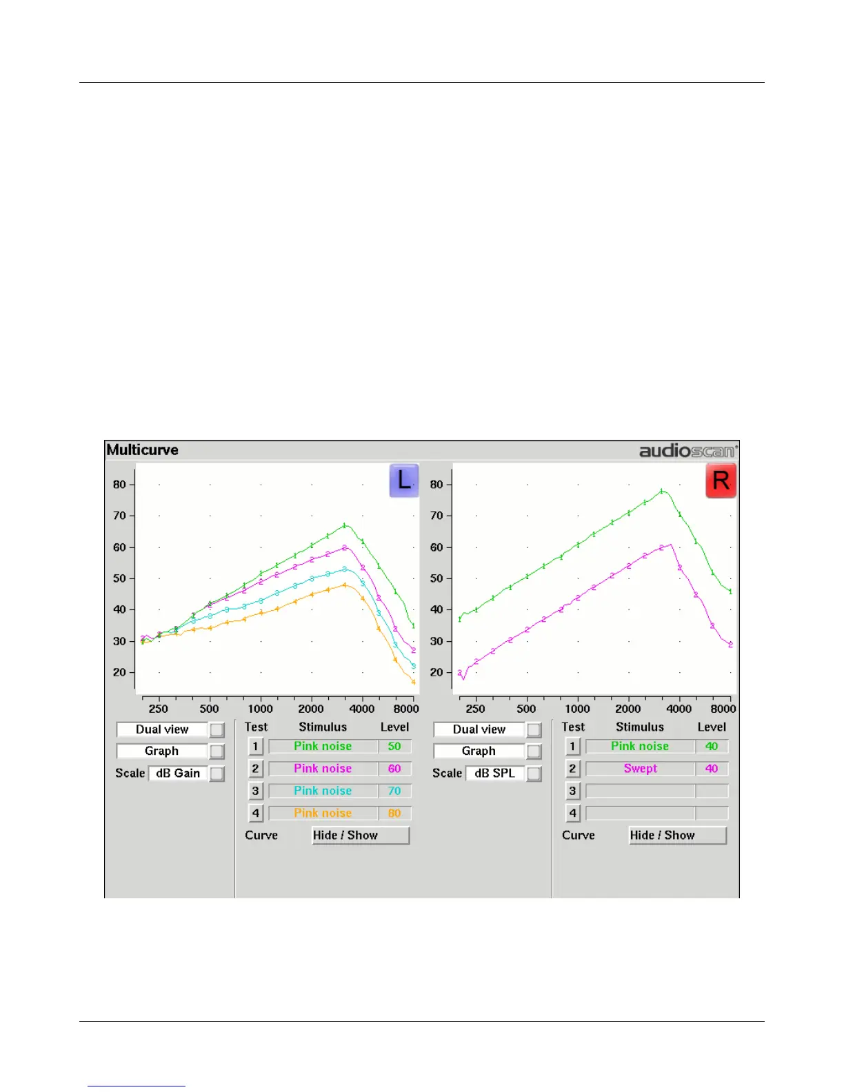 format. The Multicurve screen may be scaled in dB SPL or dB Gain. Individual curves may be hidden (but not