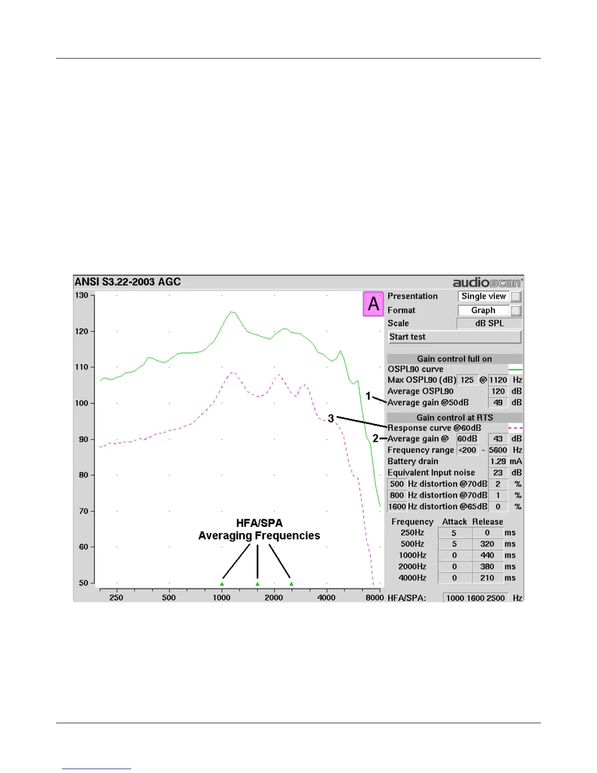 measured at 60 dB input SPL and the frequency response curve (3) is always run at 60 dB input SPL.