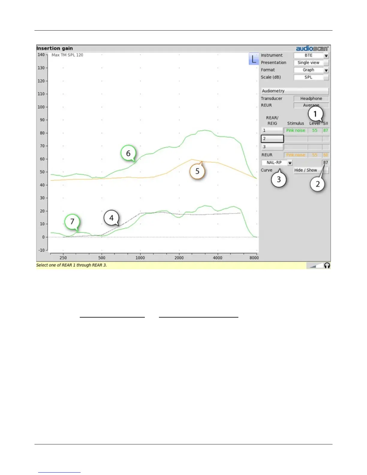 1. Speech Intelligibility Index (SII), 2. SII for target, 3. Fitting method, 4. Target REIG, 5. REUR, 6. REAR 1, 7. REIG