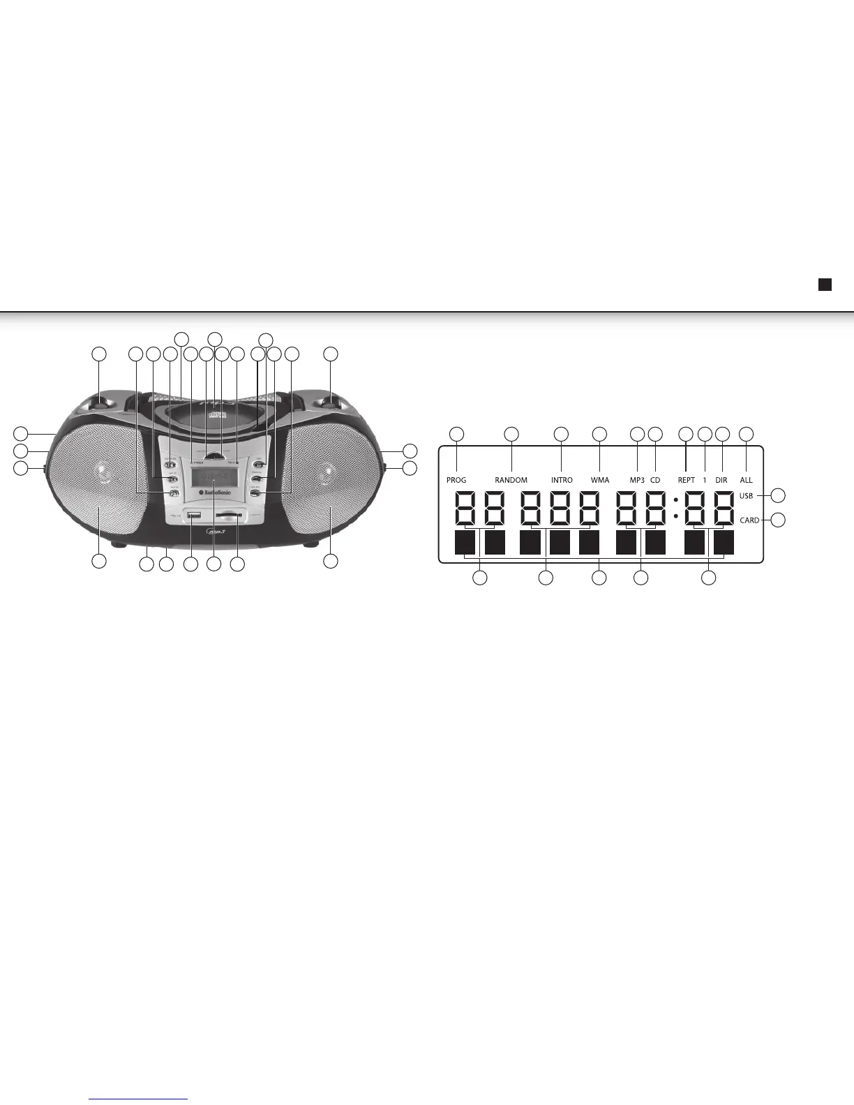 17. Wyświetlacz tekstowy. Podczas odtwarzania plików MP3 informacje na temat