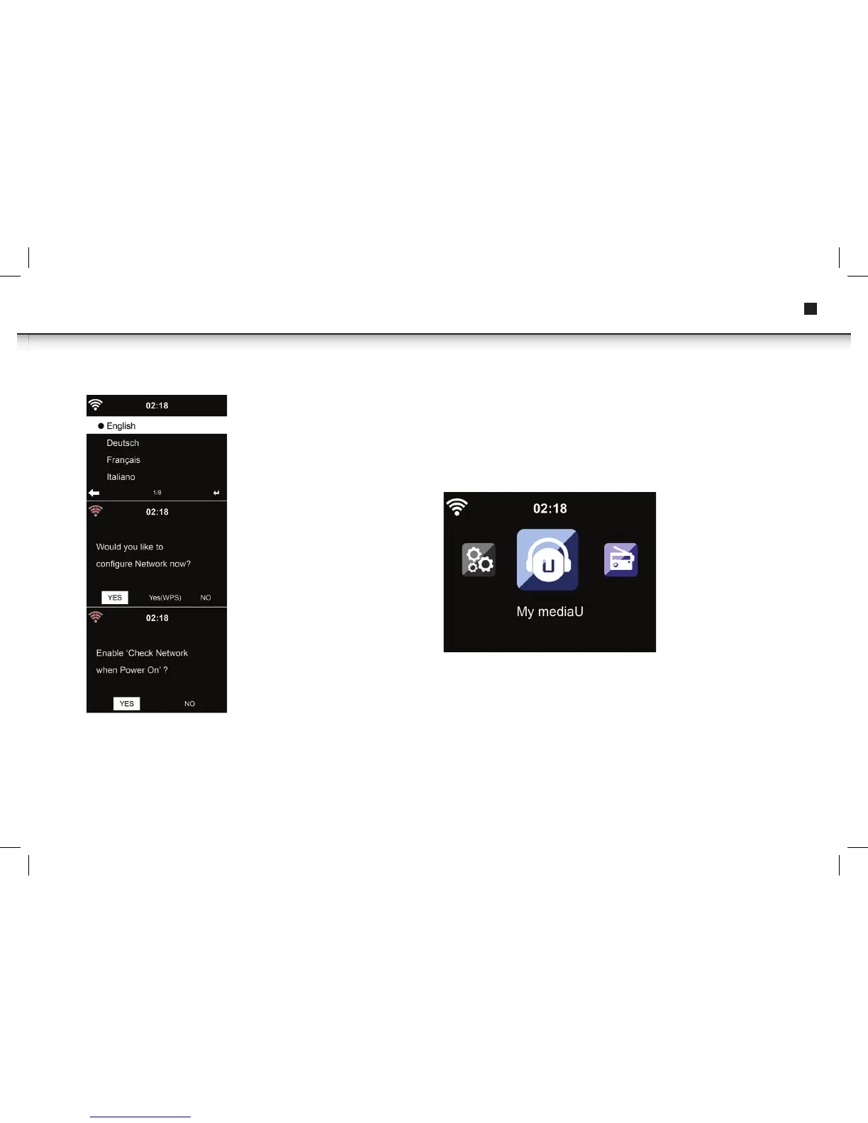 aktiviert), Internet Radio, Media Center, FM, Aux In, Informationszentrum,