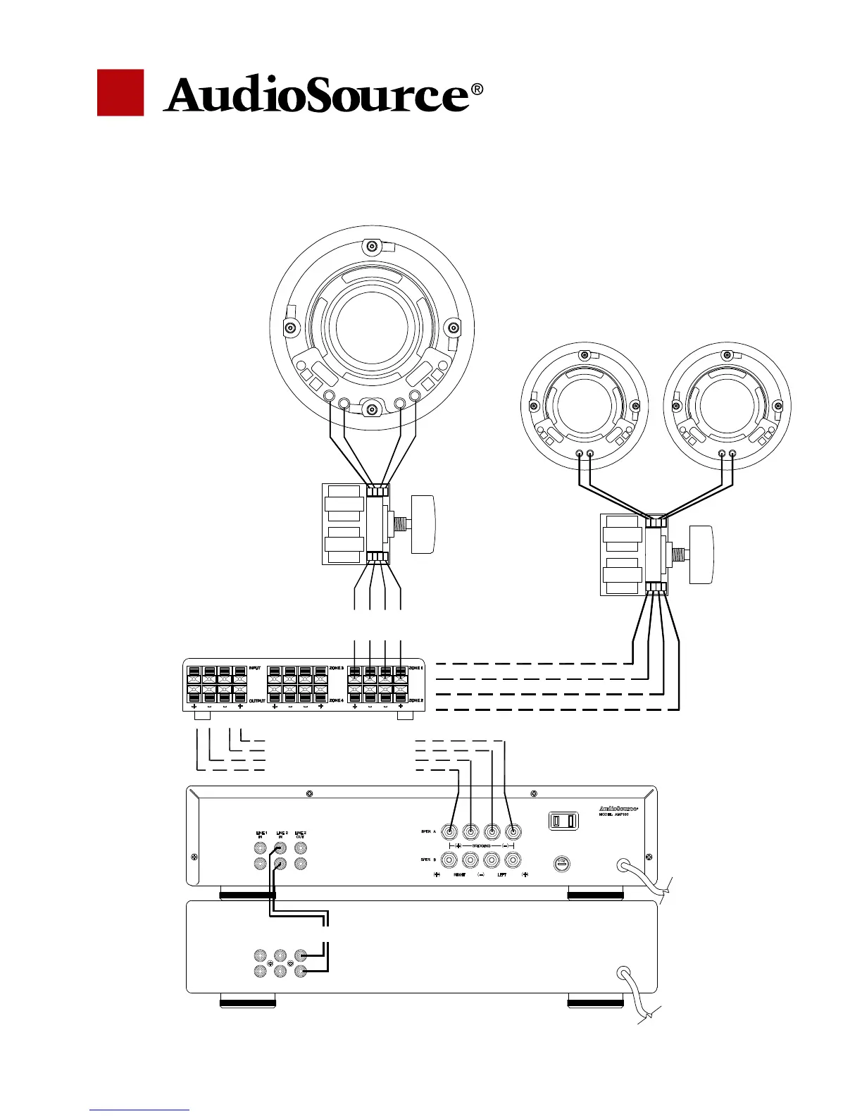 2) Scale to any number of zones by adding another amp (Line 2 OUT), or another