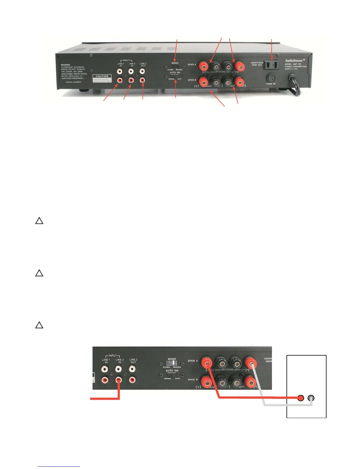 Note: Be sure to observe the correct speaker connections for bridged applications. Because of the high power output in this mode, we recommend