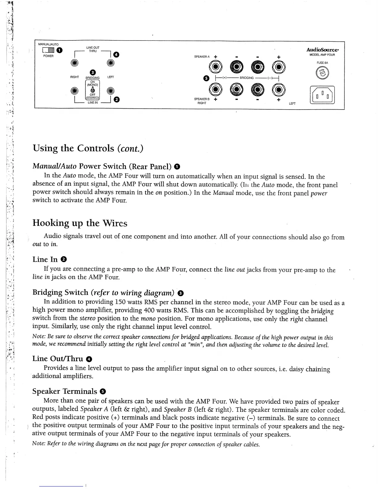 AudioSource Amp Four - Rear Panel Controls and Connections; Manual;Auto Power Switch; Audio Signal Connections; Bridging Switch Functionality