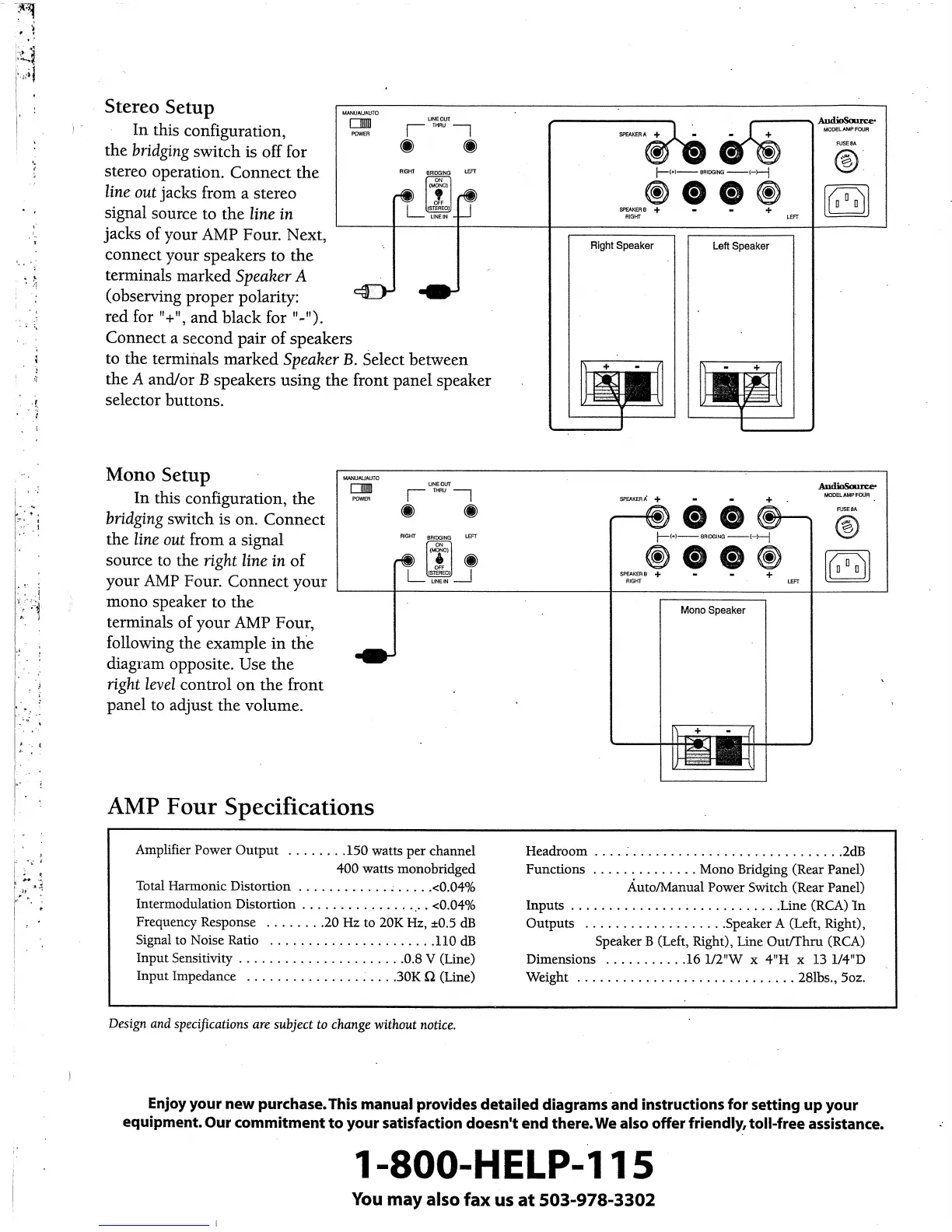 AudioSource Amp Four - Setup Configurations; Stereo Setup Guide; Mono Setup Guide; Product Specifications
