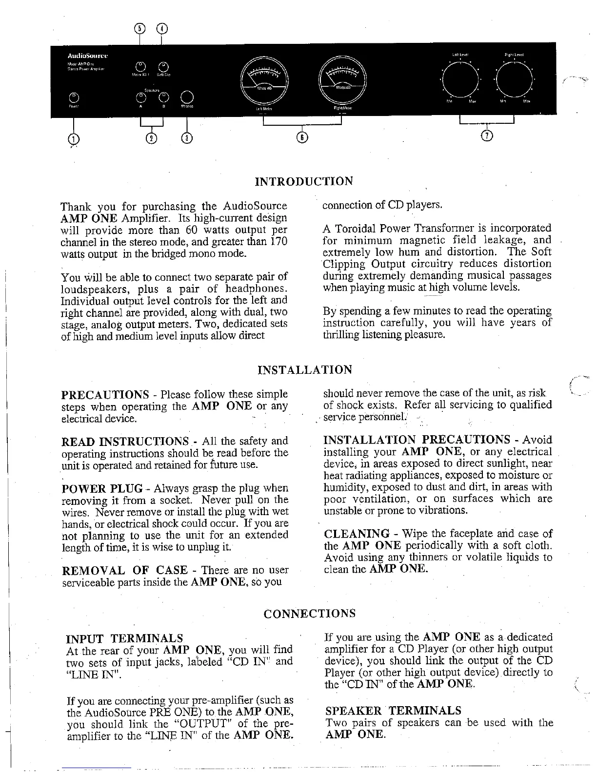 AudioSource AMP ONE - Introduction; Installation and Connections; Safety Precautions; Cleaning