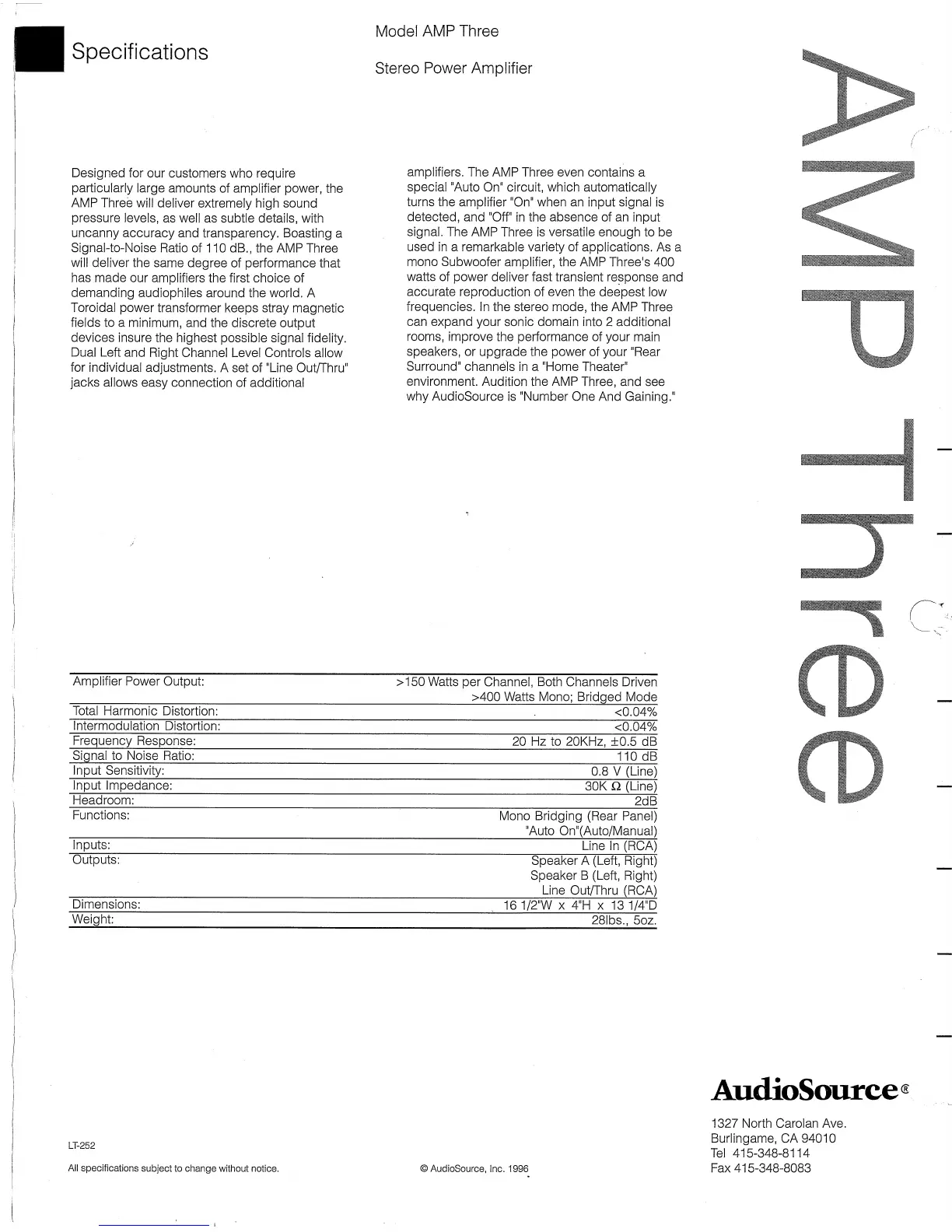 AudioSource AMP Three - Hooking up the Wires; Manual;Auto Power Switch (Rear Panel); Line In; Bridging Switch