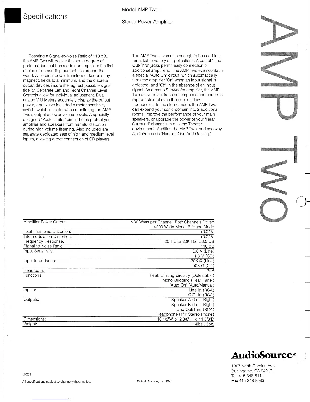 AudioSource Amp Two - Power Meters; Input Level Controls; Manual;Auto Power Switch; Hooking up the Wires