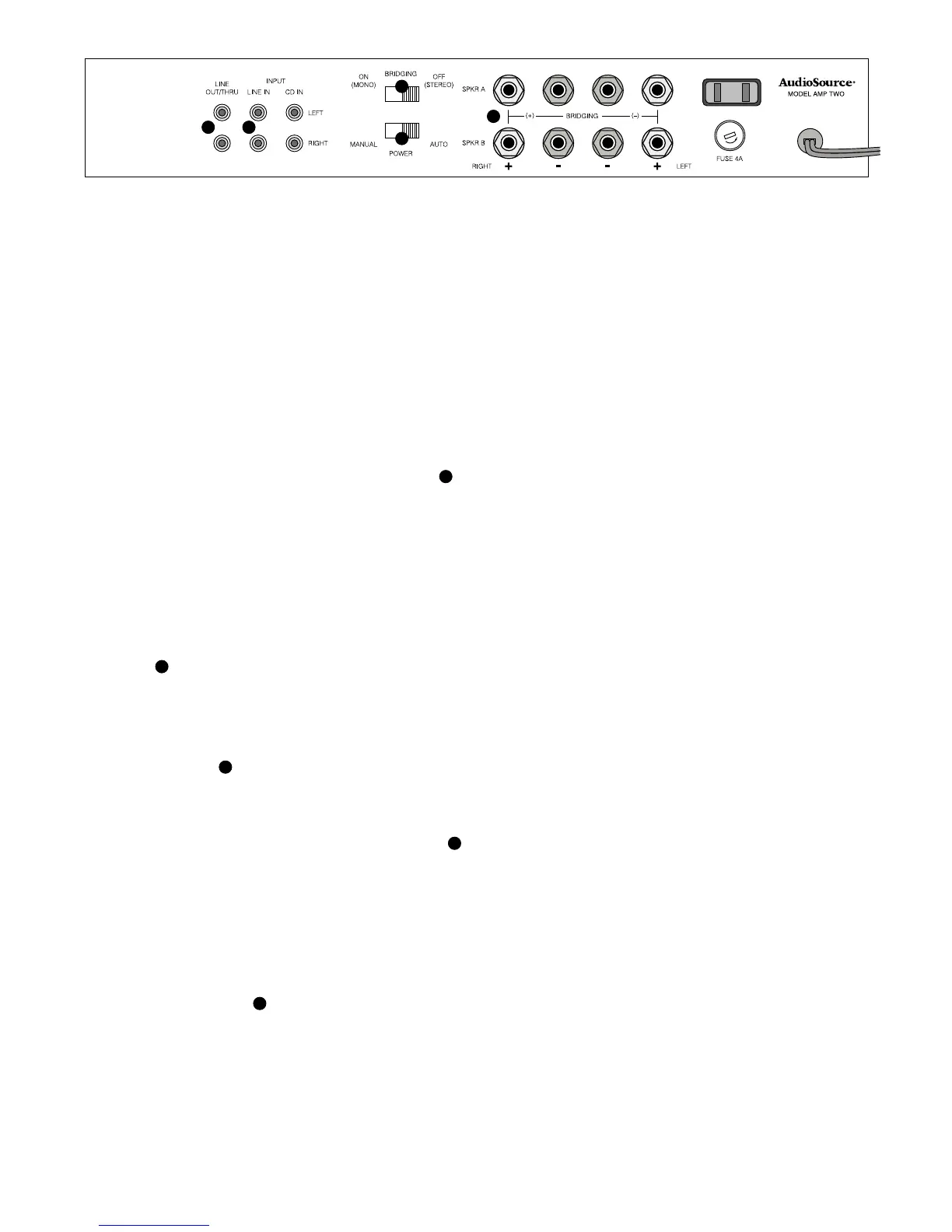 absence of an input signal, the AMP Two will shut down automatically. (In the Auto mode, the front panel