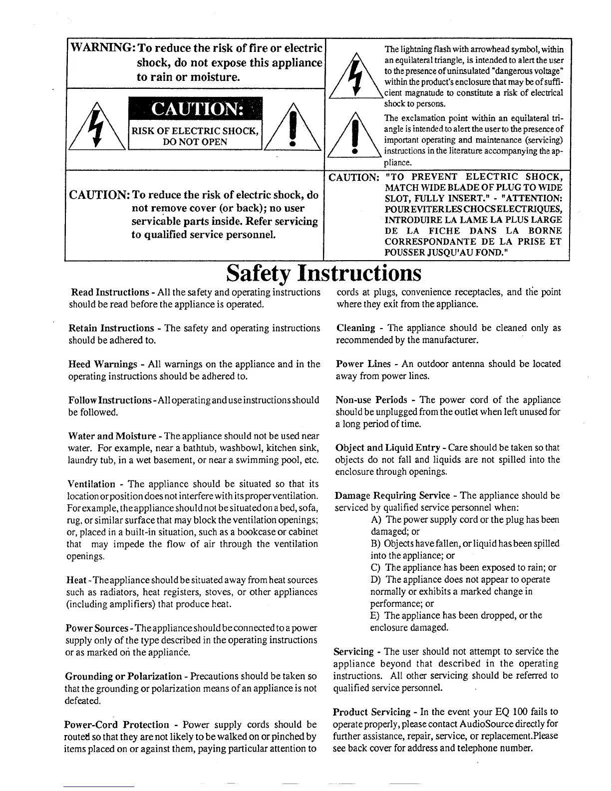 AudioSource EQ 100 - Safety Instructions; Electrical Safety Precautions; Operational and Handling Guidelines