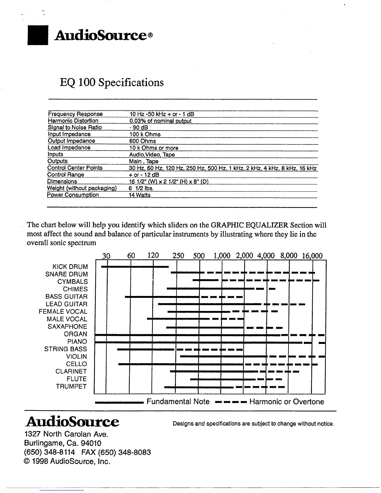 AudioSource EQ 100 - Specifications and Usage Chart; EQ 100 Technical Specifications; Instrument Frequency Guide